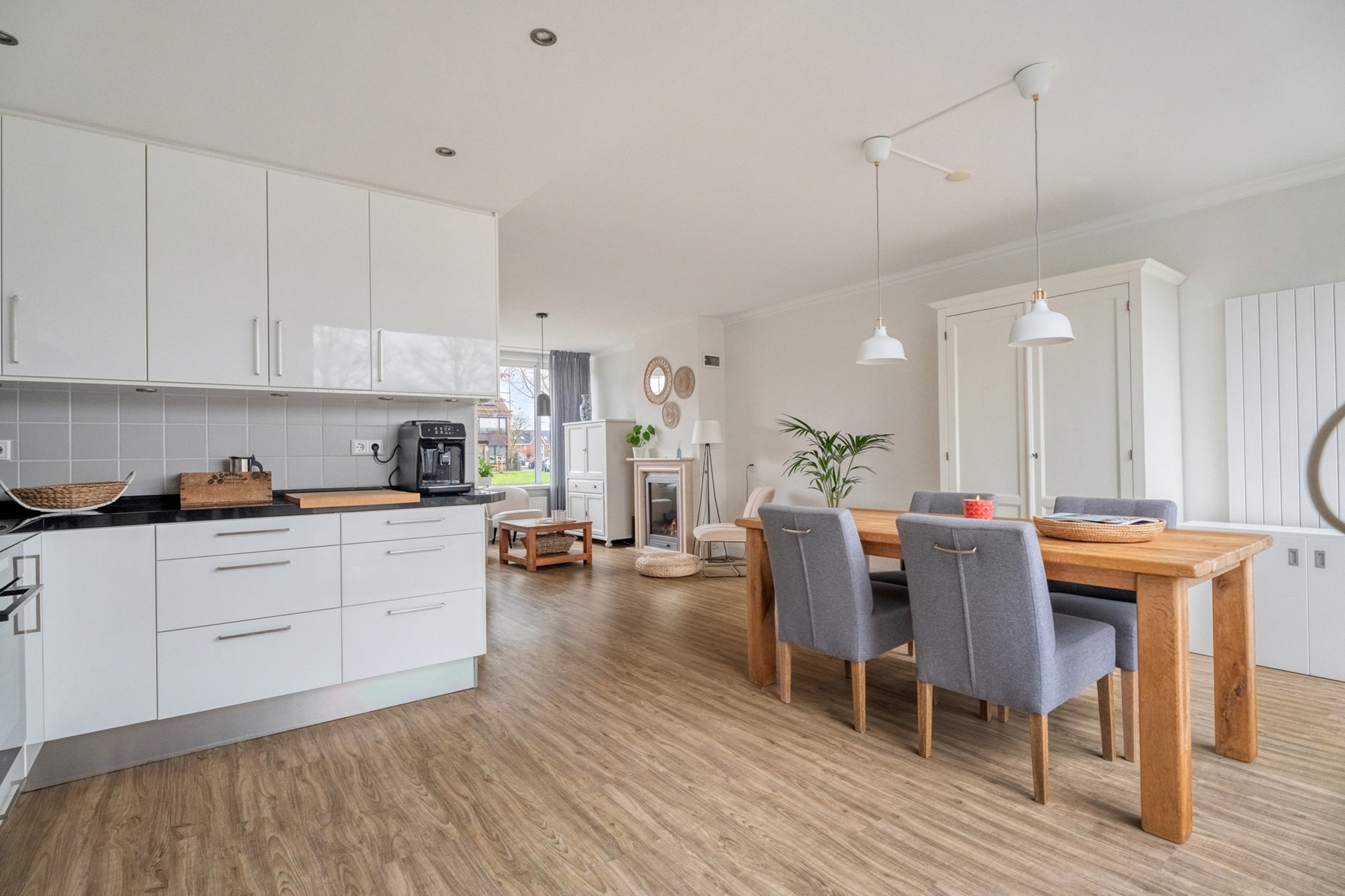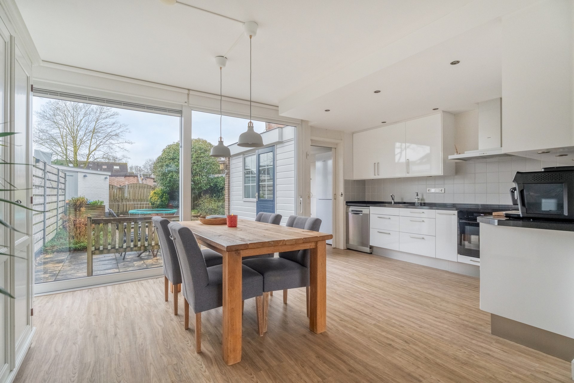 De living vormt een prettige basis voor het dagelijkse leven, met volop ruimte voor een comfortabele zithoek en een royale eethoek. De indeling voelt logisch en ruimtelijk aan, waardoor je hier eenvoudig jouw eigen woonstijl kunt laten samensmelten met het huis.