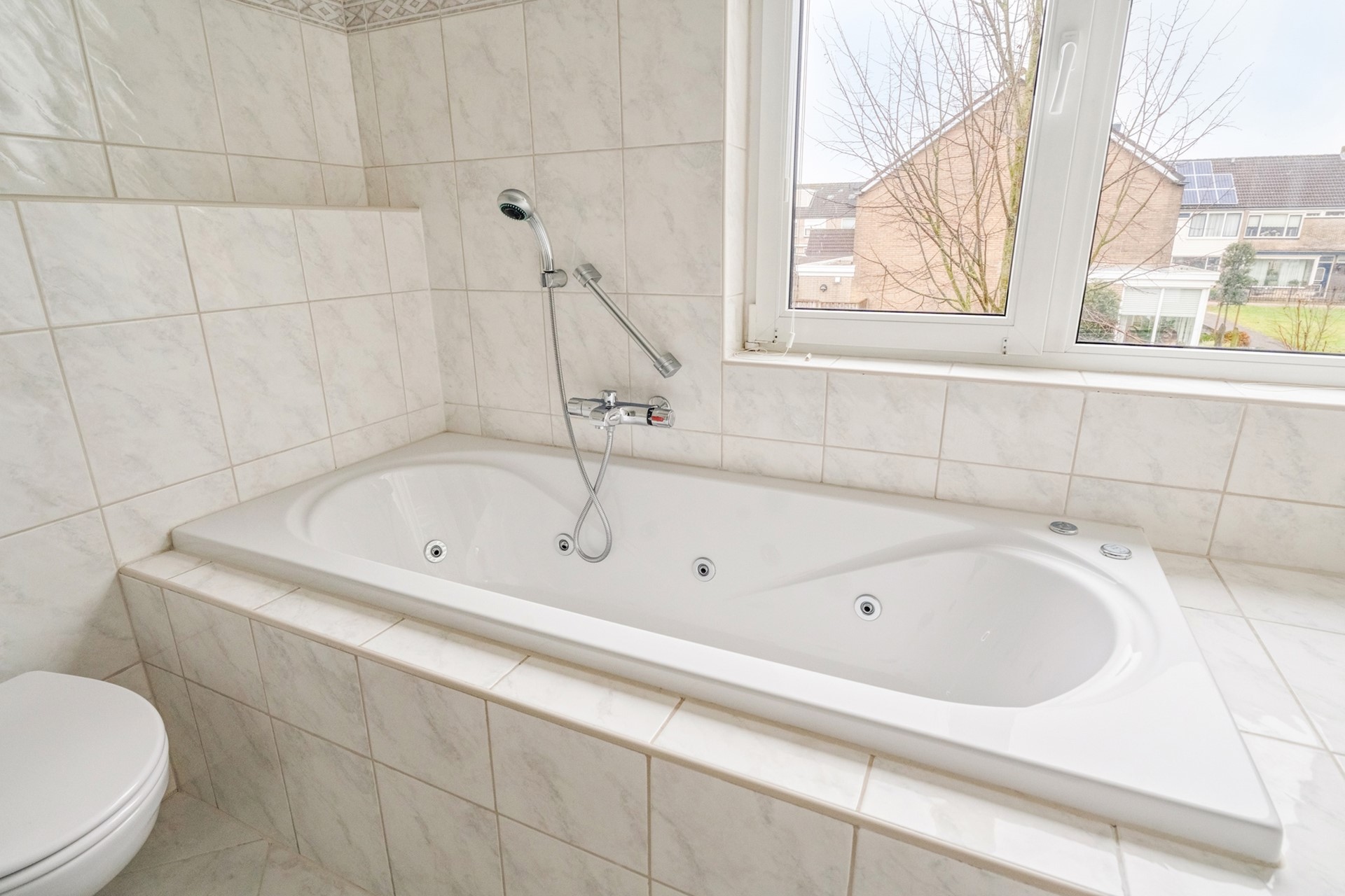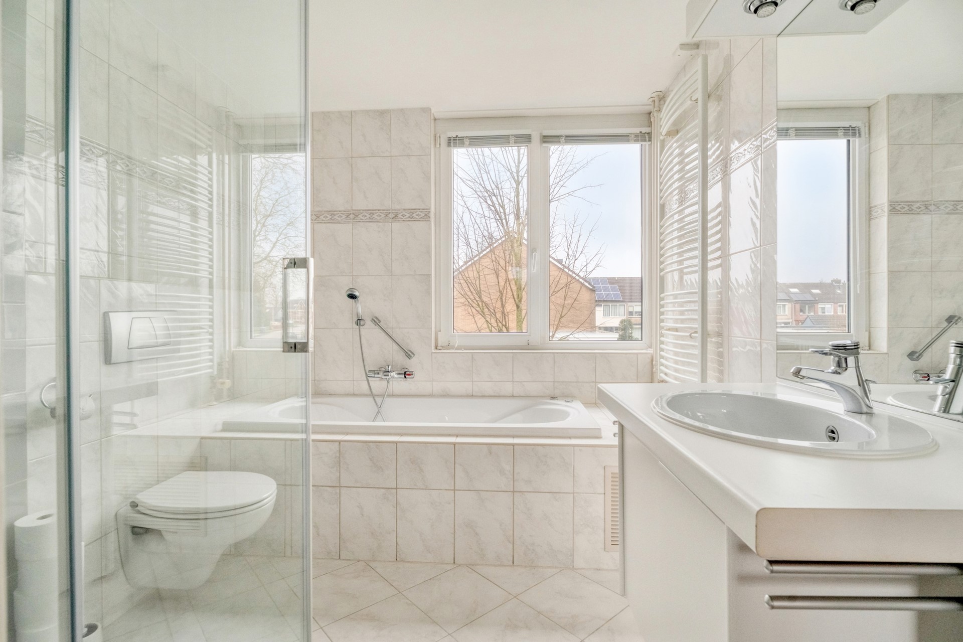 De badkamer is centraal gelegen en functioneel ingericht met een ligbad, douche en wastafel. De indeling van deze verdieping is praktisch en overzichtelijk, waarbij het extra comfort van de elektrische rolluiken bijdraagt aan een aangenaam woon- en slaapklimaat.