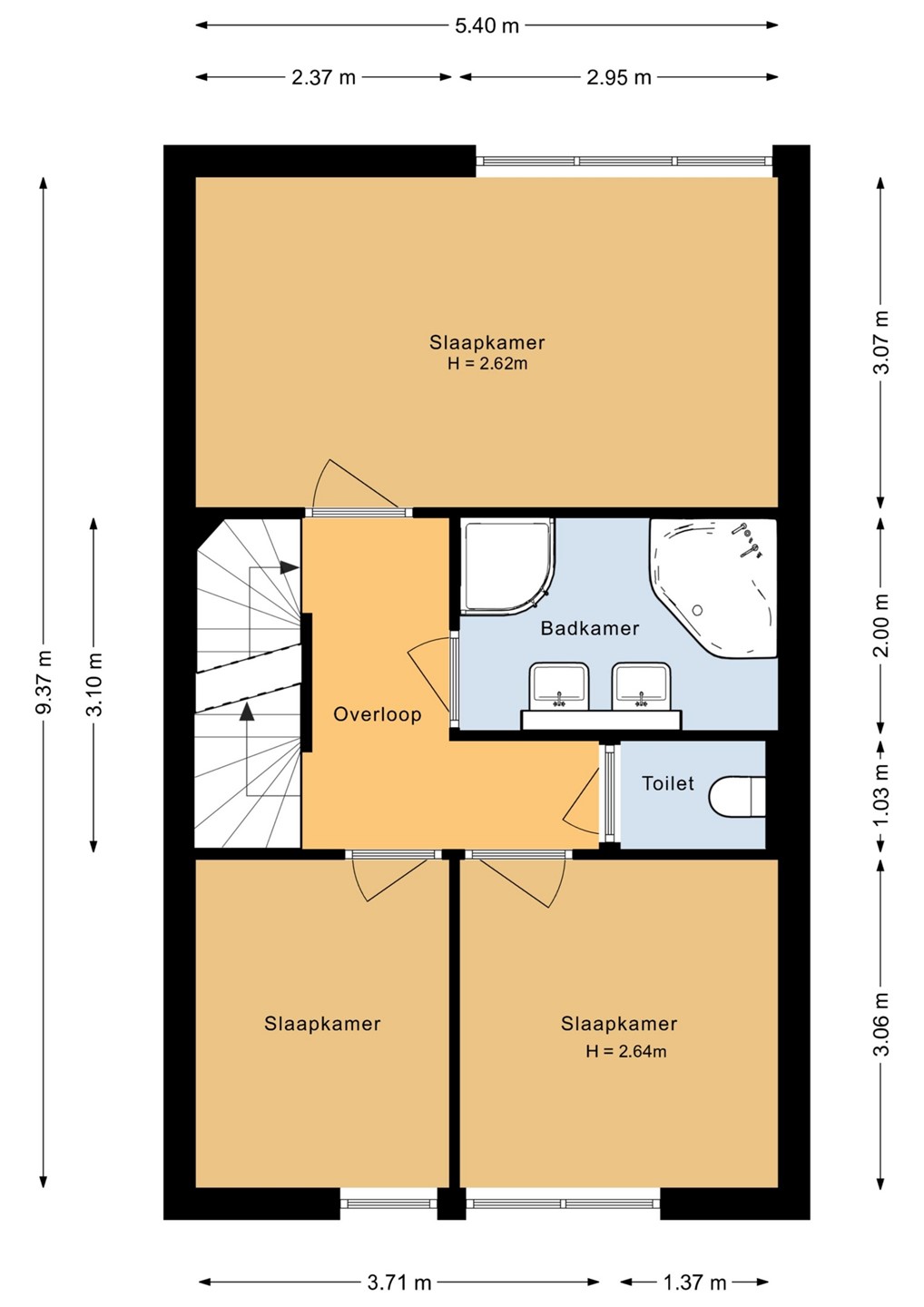 Op de tweede verdieping tref je nog twee slaapkamers, beide voorzien van handige knieschotten. Daarnaast is er op de overloop ruimte voor de wasmachine en extra opbergruimte.