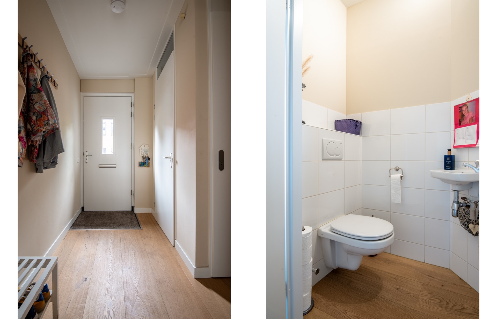Je komt binnen via de entree met toegang tot de meterkast en het toilet. Vanuit de hal stap je in de eetkamer, die direct in verbinding staat met de keuken aan de voorzijde. Achterin vind je de lichte woonkamer met schuifdeuren naar de tuin. Daarnaast zijn er handige kasten onder de trap voor extra bergruimte.
