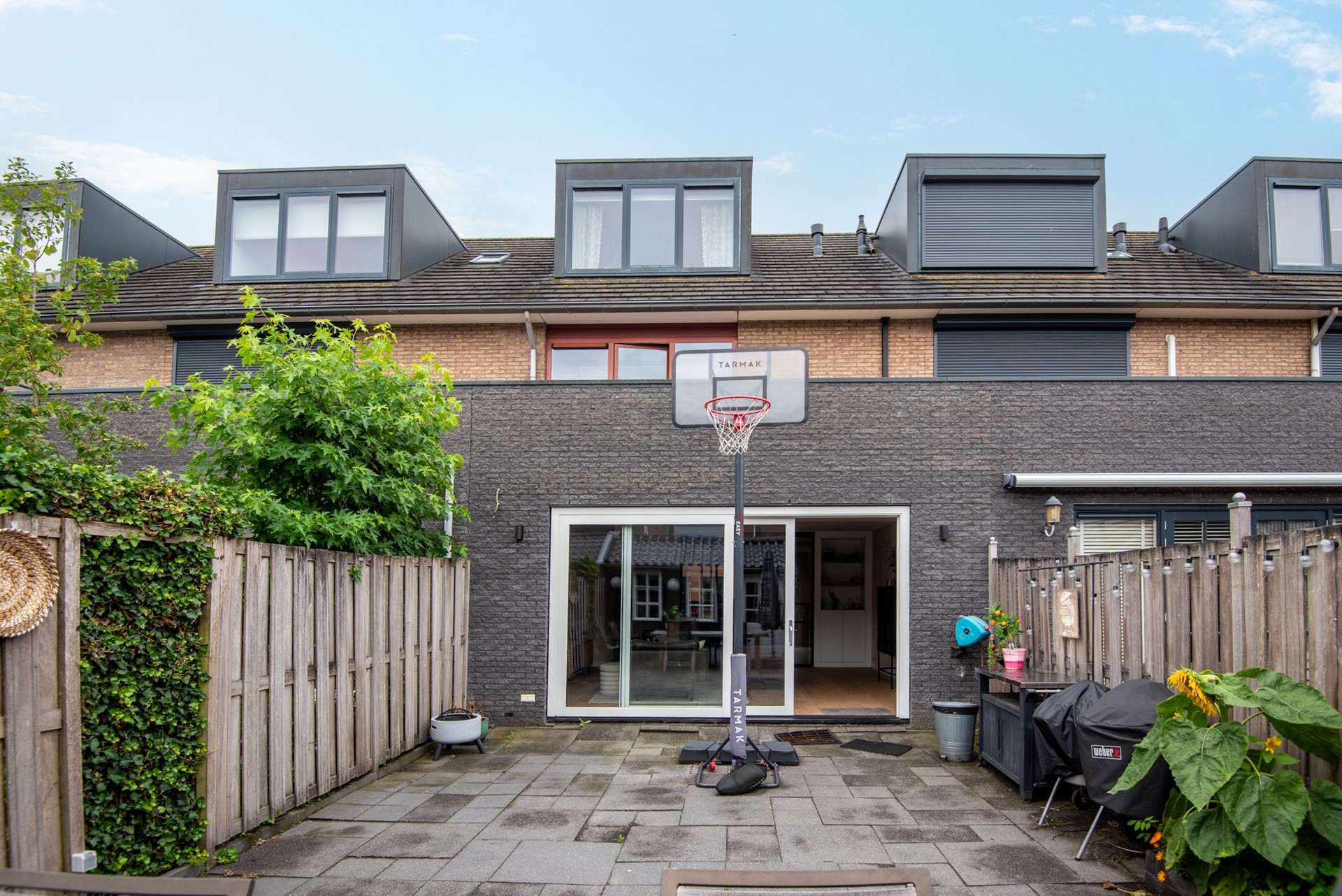 De woning beschikt over een ruime, onderhoudsvriendelijke achtertuin met veel bestrating, ideaal voor buitenactiviteiten en gezellig samenzijn. Aan de woningzijde zorgen grote schuifpuien voor een fijne verbinding tussen binnen en buiten. Achter in de tuin staat een praktische berging met dubbele deuren en ramen, perfect te gebruiken als opslagruimte of hobbyruimte.
