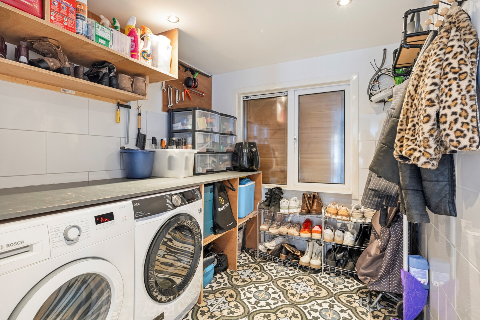 Aansluitend treft u een praktische bijkeuken met opstelplaats voor witgoed en extra bergruimte. Tevens bevindt zich hier het toilet. Vanuit de bijkeuken is er eveneens toegang tot de tuin met overkapping.