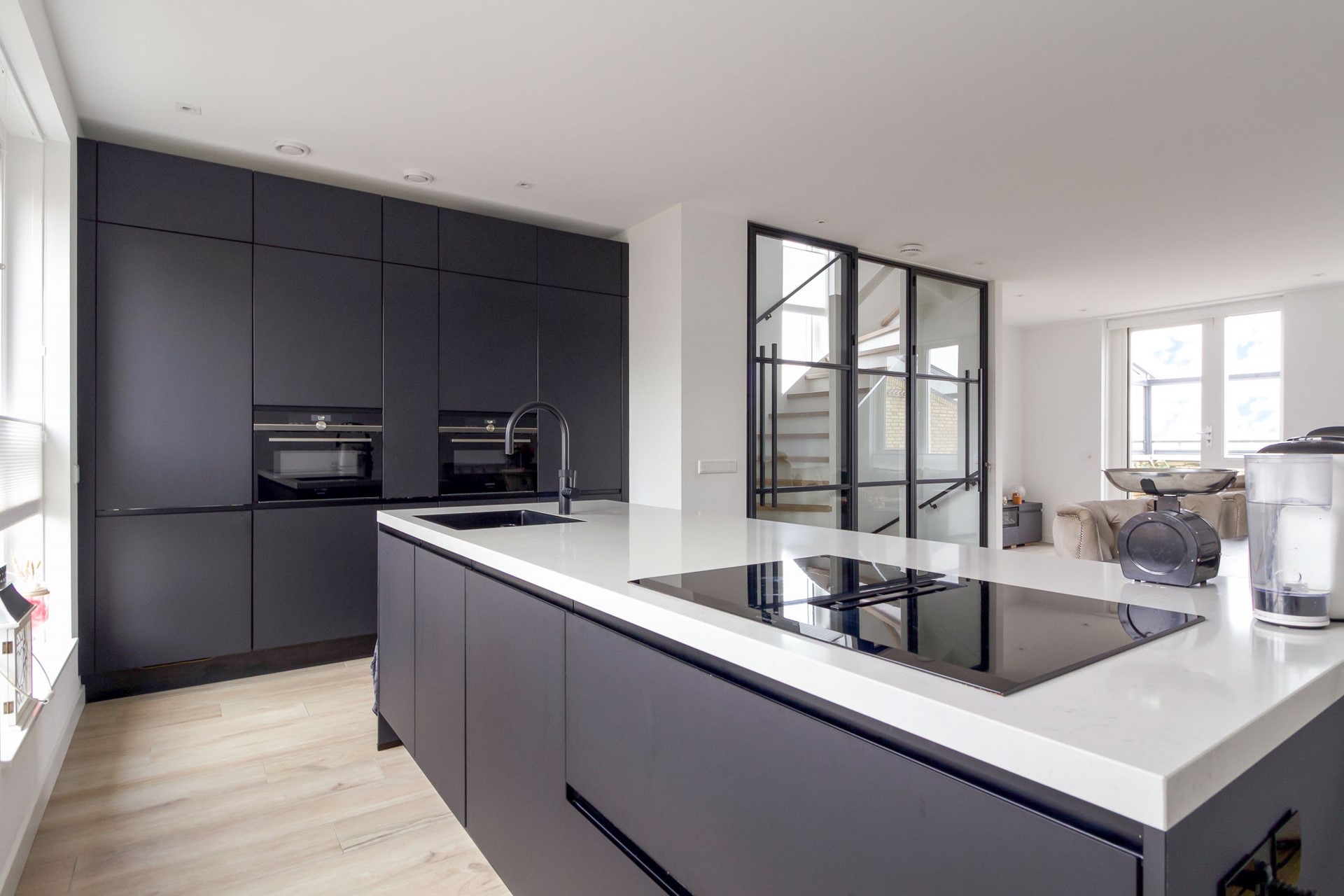 Op de eerste etage ontvouwt zich het hart van de woning. De woonkamer en keuken vormen samen een sfeervolle leefverdieping waar afwerking en luxe samenkomen. Stalen deuren en strak afgewerkte wanden zorgen voor een moderne, rustige uitstraling die direct prettig aanvoelt. Vanuit de woonkamer stap je het dakterras op, een heerlijk verlengstuk van de leefruimte waar het uitzicht over het Eemmeer elke dag weer indruk maakt. Dankzij de afsluitbare opzet is dit een plek waar binnen en buiten moeiteloos in elkaar overlopen.