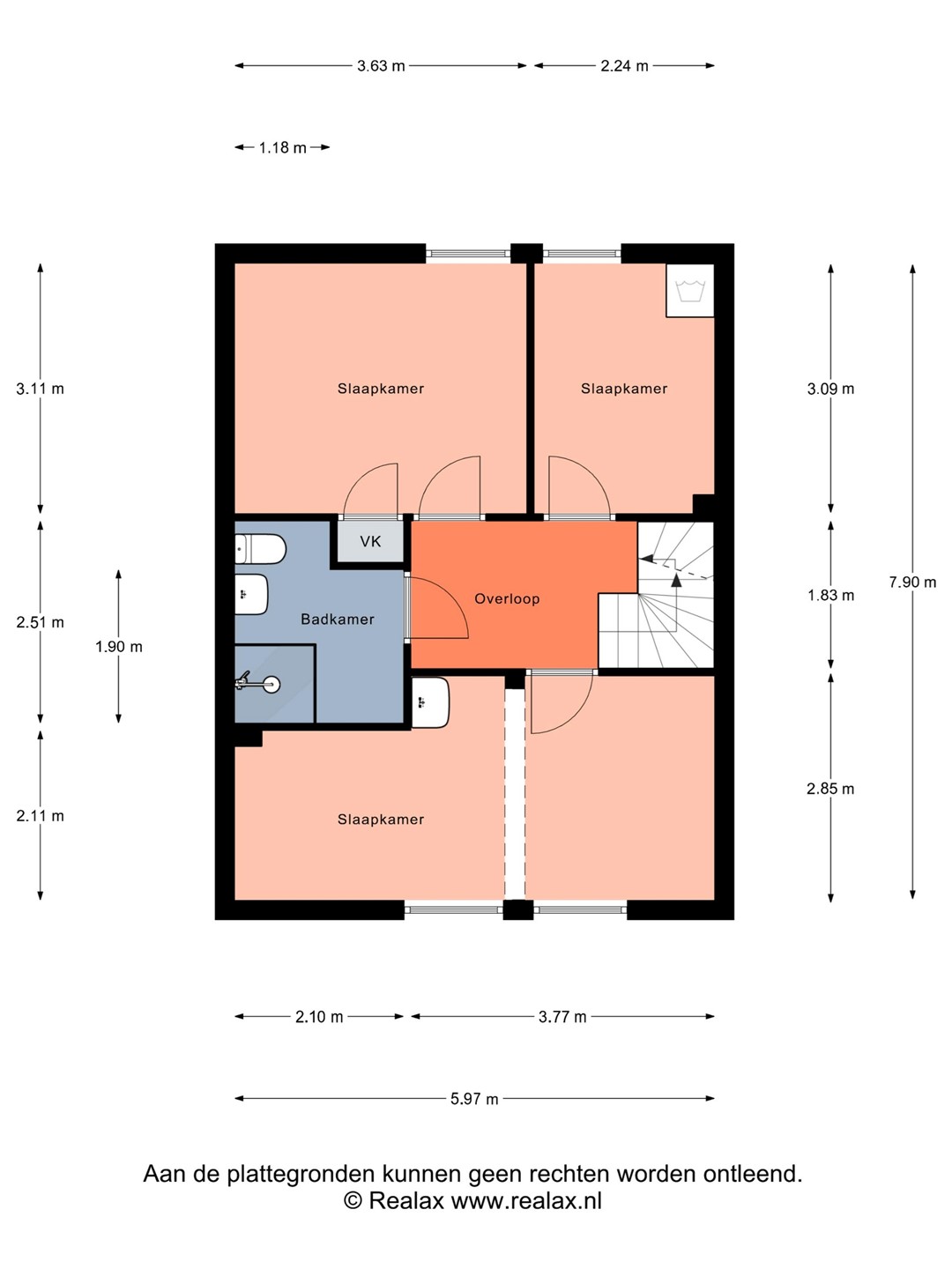 Via de overloop heb je toegang tot drie slaapkamers, stuk voor stuk van een goed formaat en praktisch in te delen. De kamers zijn voorzien van voldoende daglicht, wat zorgt voor een prettige en lichte sfeer.