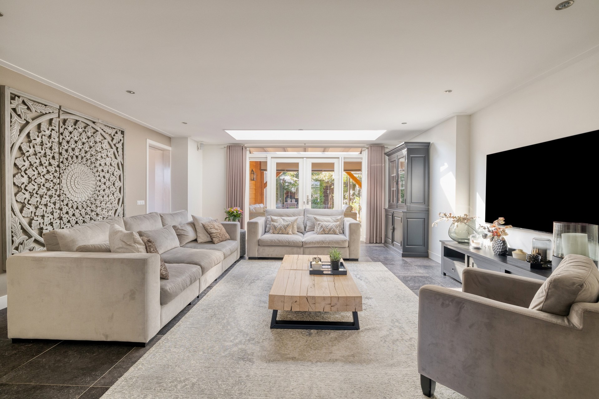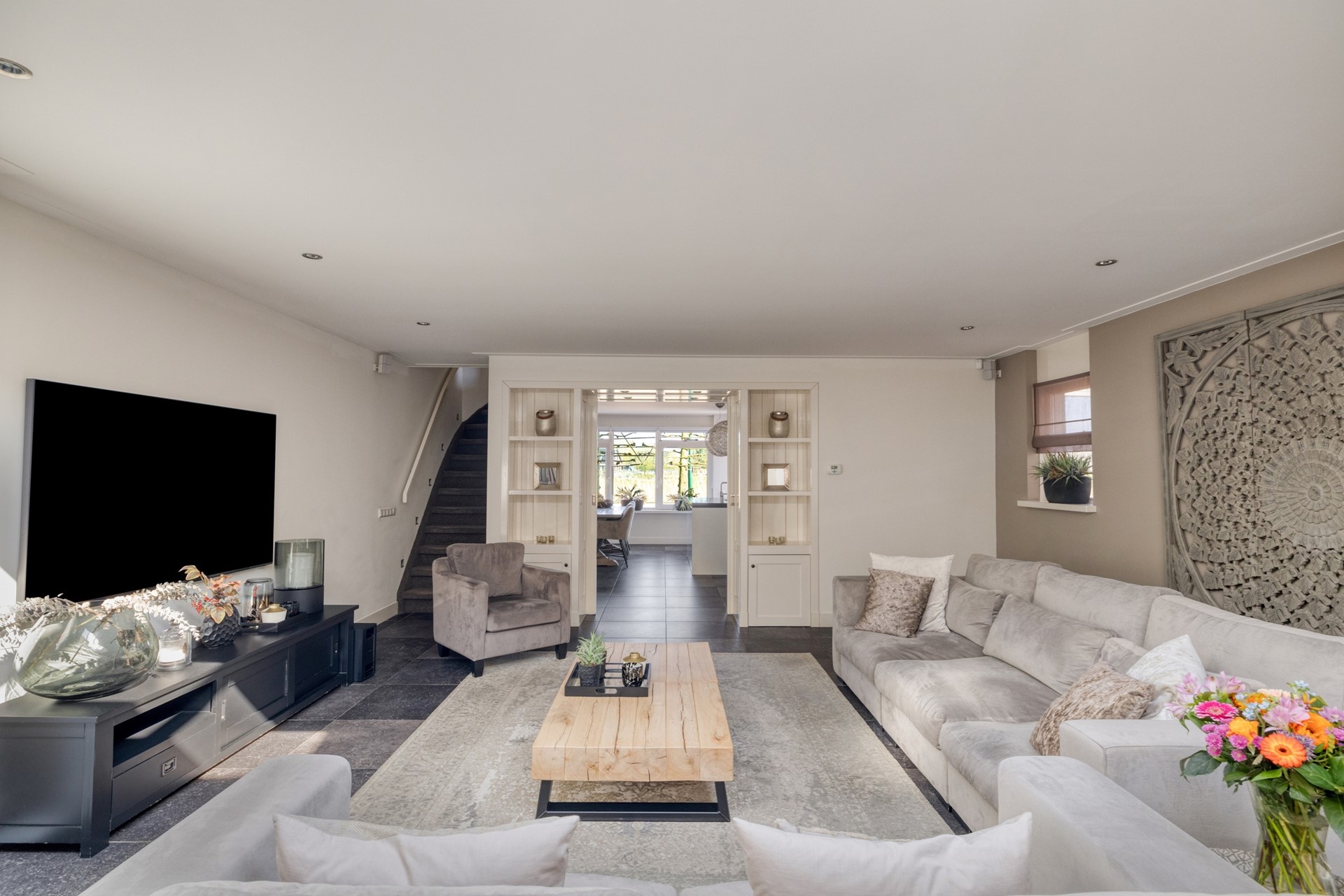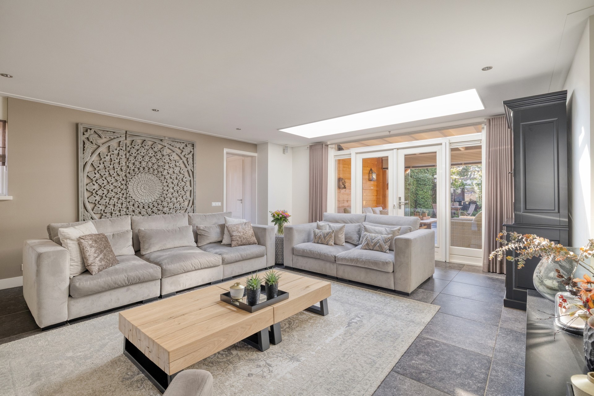Binnen voel je direct de ruimte. De indeling is doordacht en luxe, met een woonkeuken waar koken en samenzijn vanzelf samenkomen en een woonkamer van formaat die uitnodigt om te ontspannen. Aan de achterzijde vormt de veranda een prachtig verlengstuk van de woning, waardoor binnen en buiten naadloos in elkaar overlopen. De tuin ligt gunstig op het zuiden en biedt precies de juiste balans tussen zon, ruimte en beschutting.