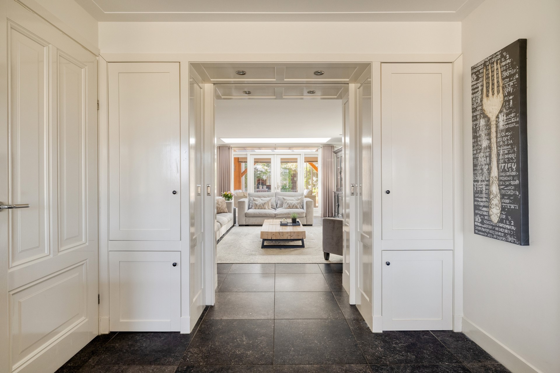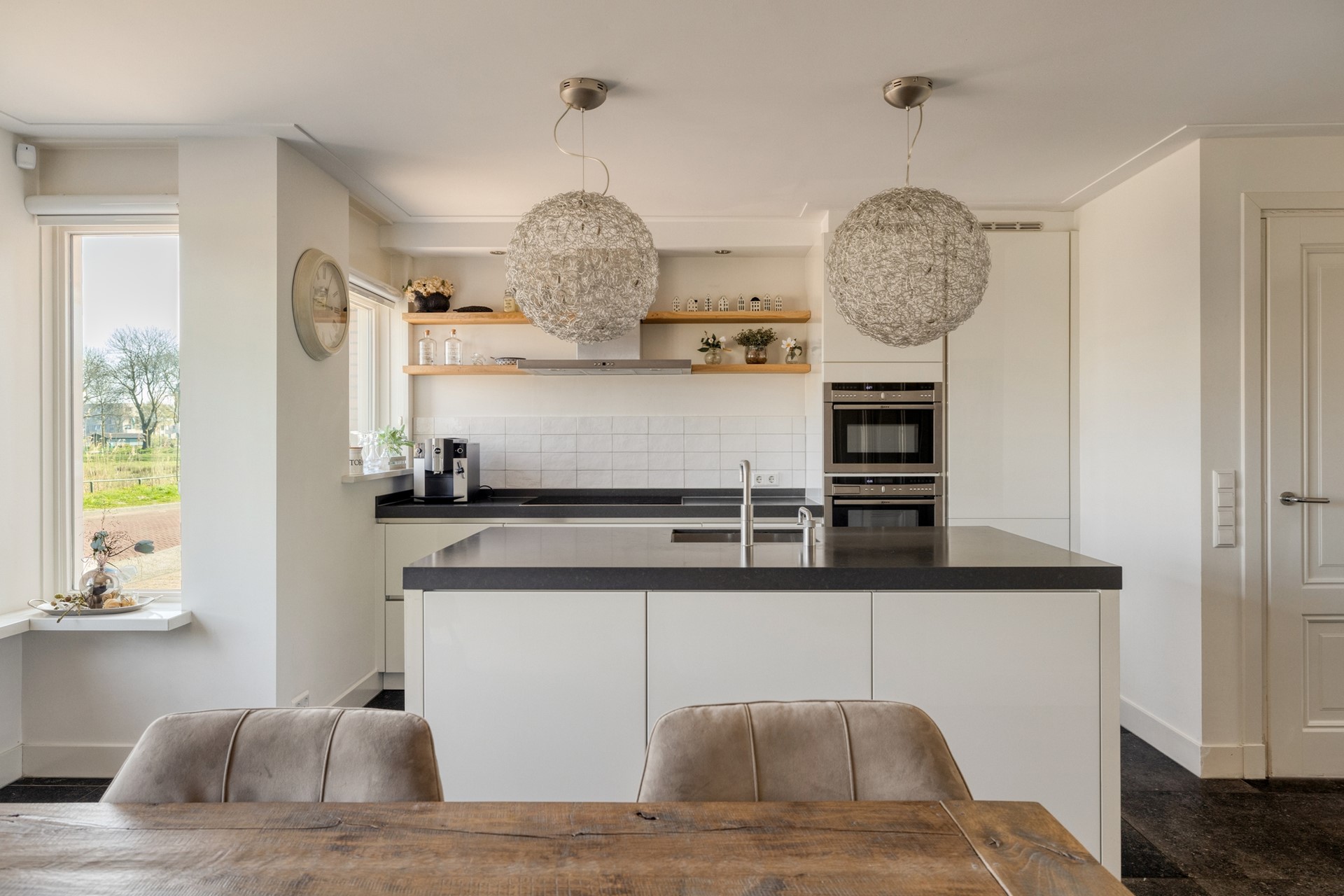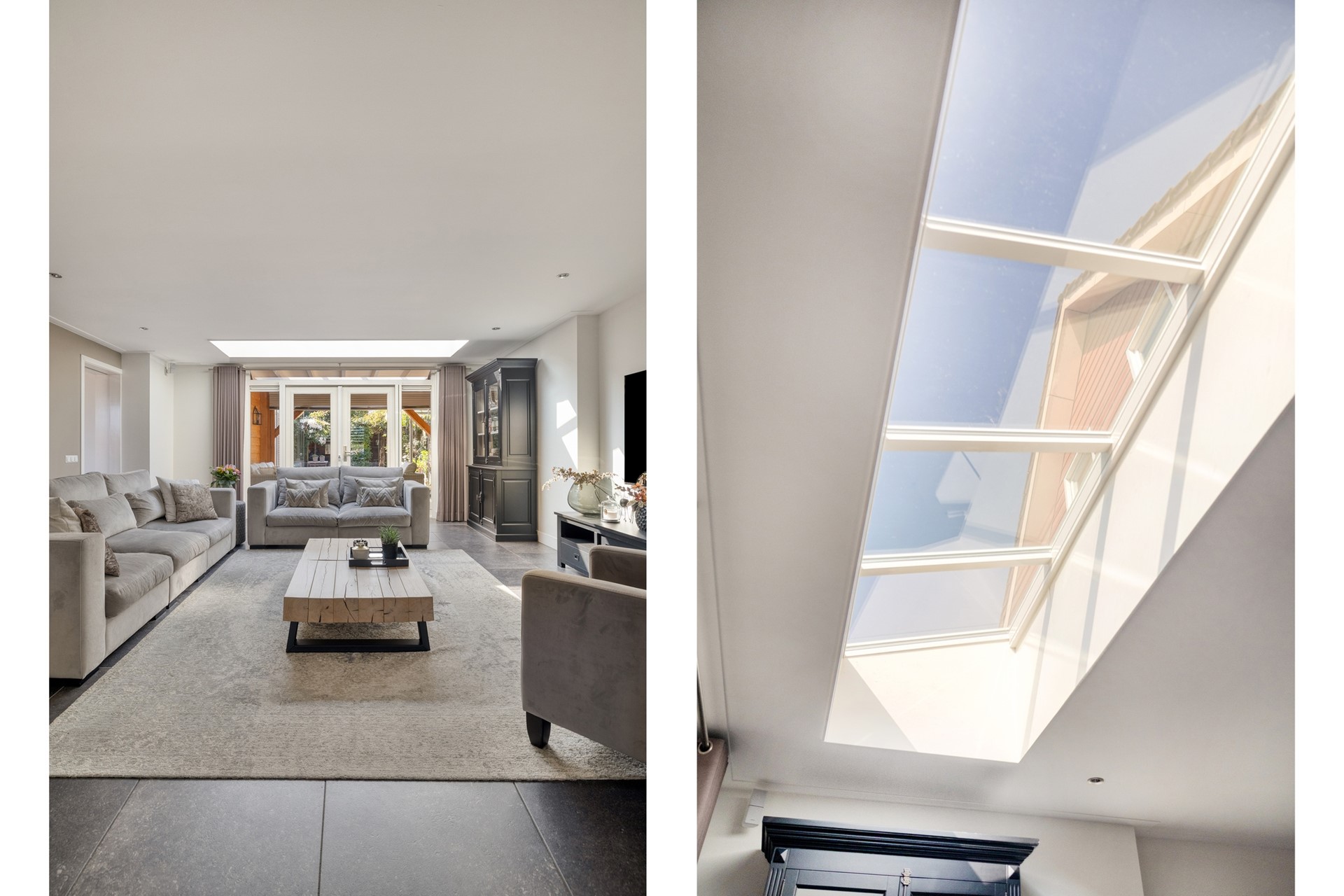 Binnen voel je direct de ruimte. De indeling is doordacht en luxe, met een woonkeuken waar koken en samenzijn vanzelf samenkomen en een woonkamer van formaat die uitnodigt om te ontspannen. Aan de achterzijde vormt de veranda een prachtig verlengstuk van de woning, waardoor binnen en buiten naadloos in elkaar overlopen. De tuin ligt gunstig op het zuiden en biedt precies de juiste balans tussen zon, ruimte en beschutting.