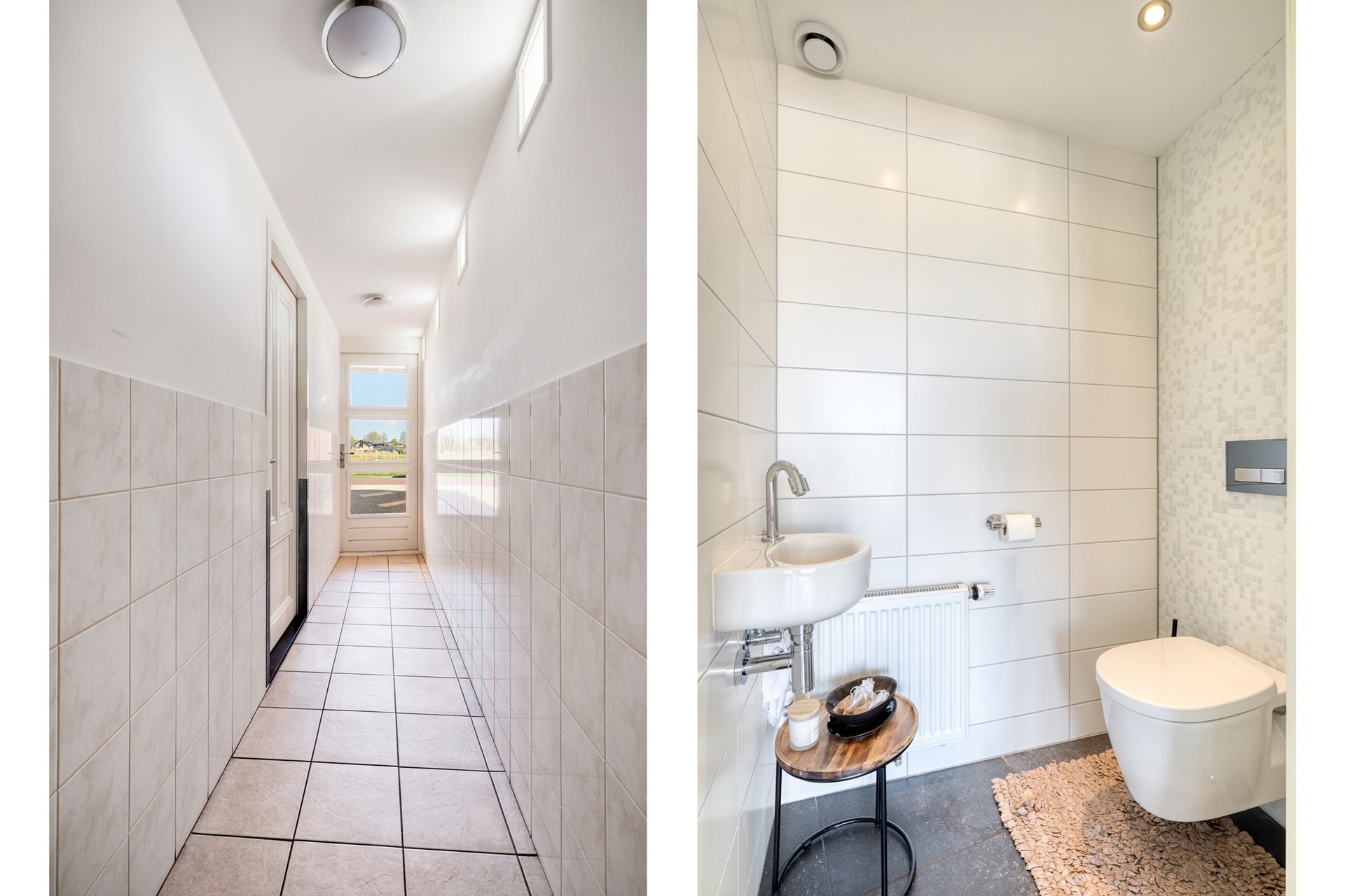 Via de woonkamer bereikt u een tweede hal met separaat toilet en doorgang naar de bijkeuken. De bijkeuken is voorzien van een extra keukenopstelling en biedt toegang tot de overkapping en achterzijde van de woning.