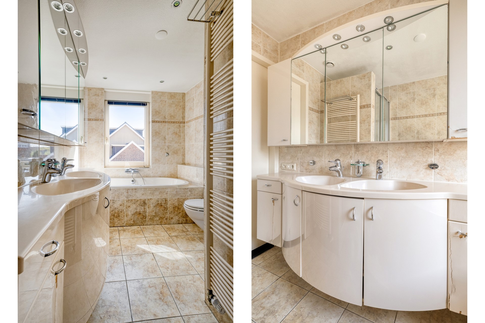 De badkamer is centraal gelegen en voorzien van een (bubbel)bad, douche, wastafel en toilet.