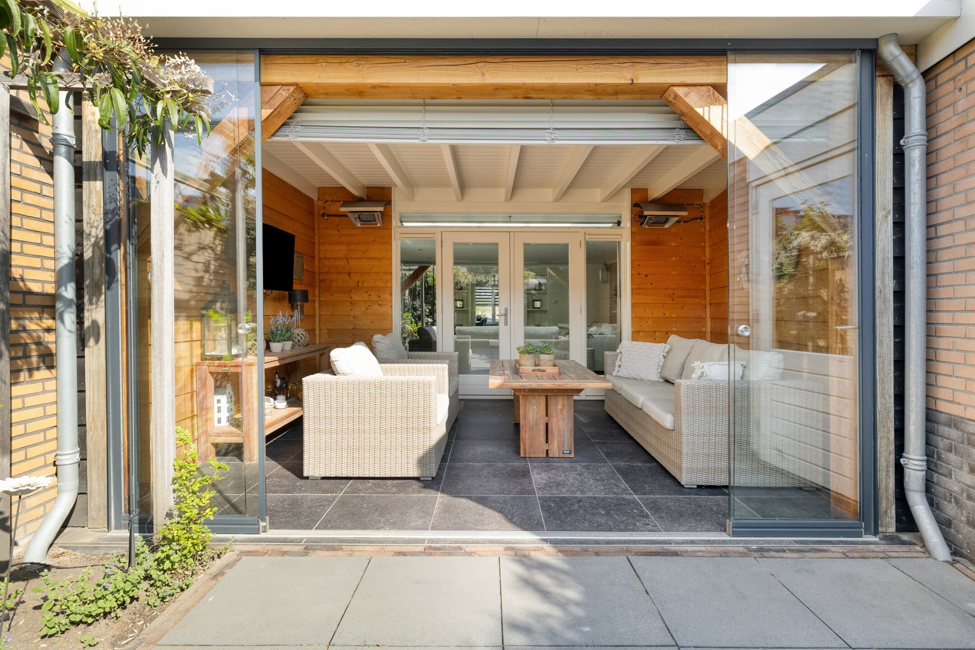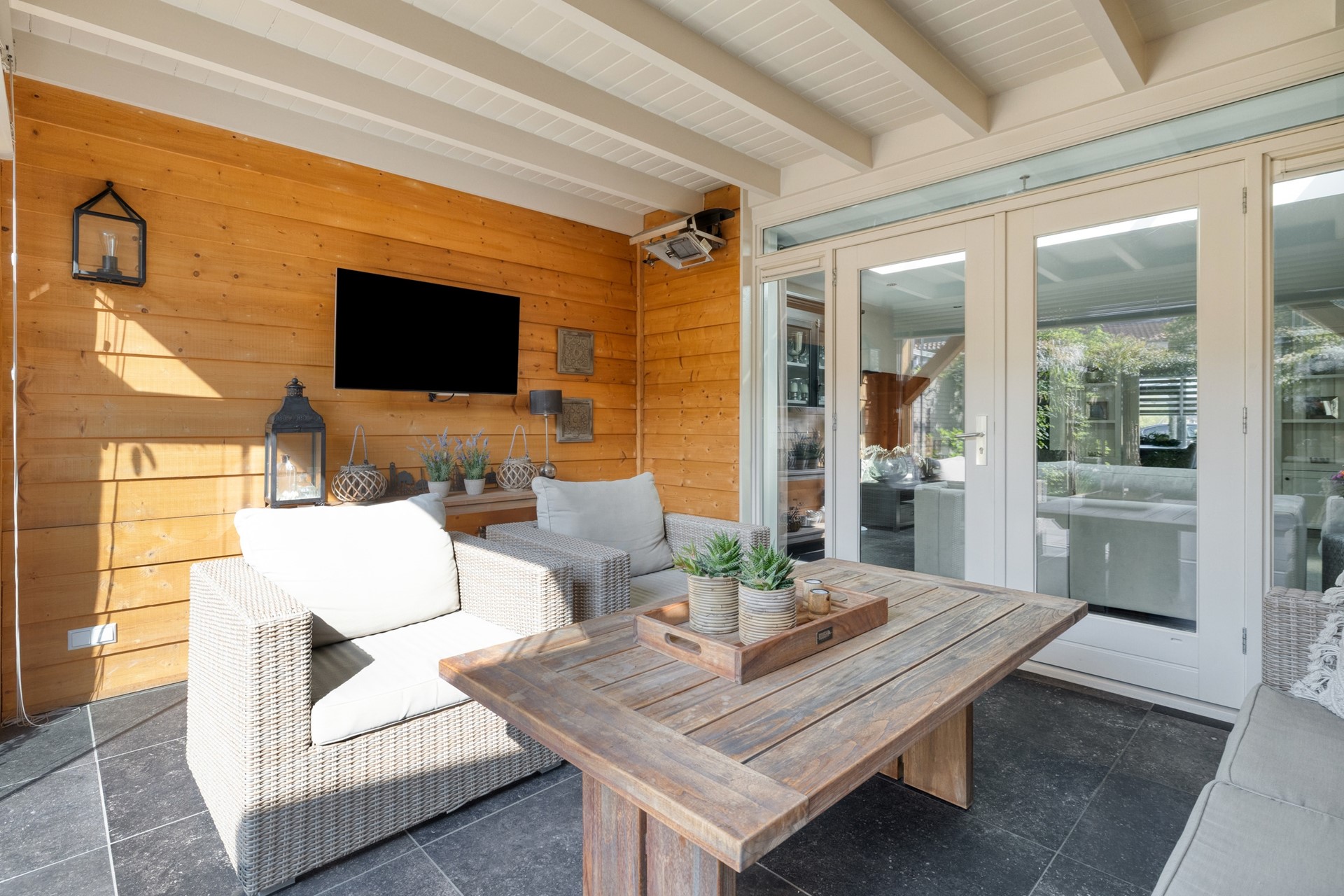 De serre vormt een fijne extra leefruimte en staat in directe verbinding met de woonkamer en de tuin.