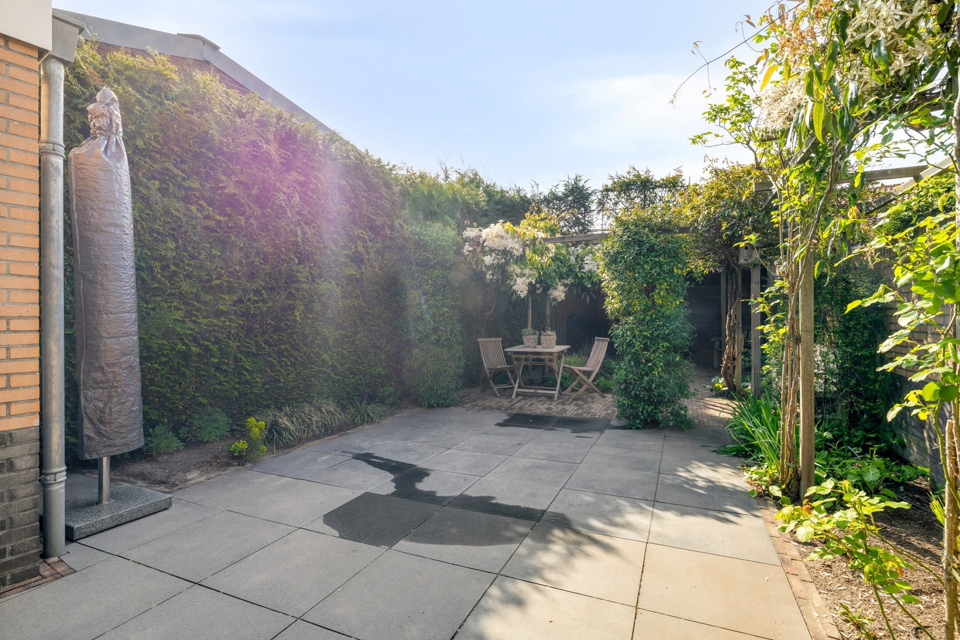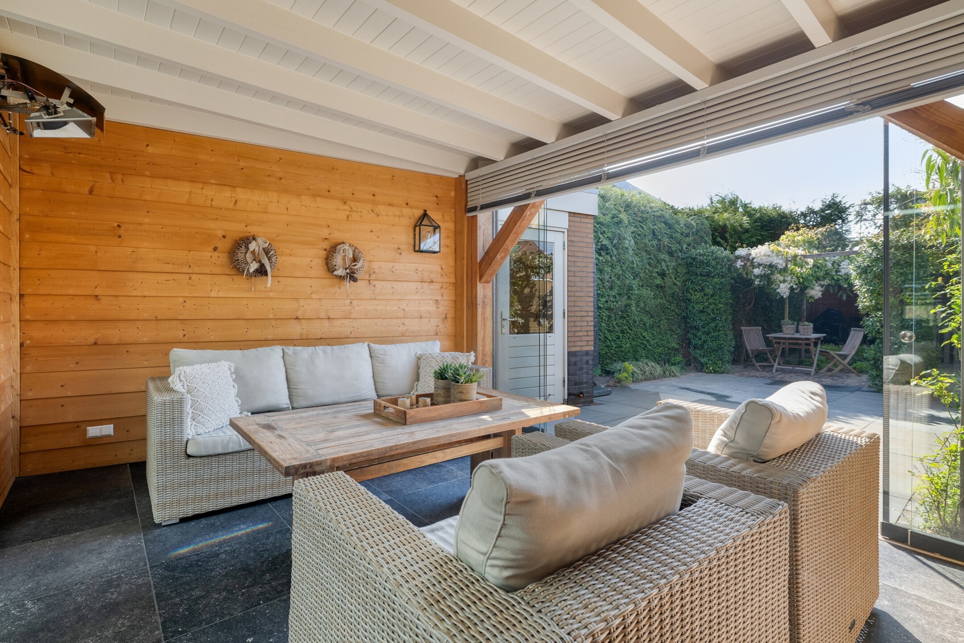 Achterin de tuin bevindt zich een gezellige overkapping, ideaal voor lange zomeravonden of beschut buiten zitten in het voor- en najaar. Daarnaast is er een stijlvolle serre direct aan de woning, waardoor binnen en buiten naadloos in elkaar overlopen. Dankzij de groene erfafscheidingen geniet u hier van veel privacy en een rustige, beschutte sfeer.