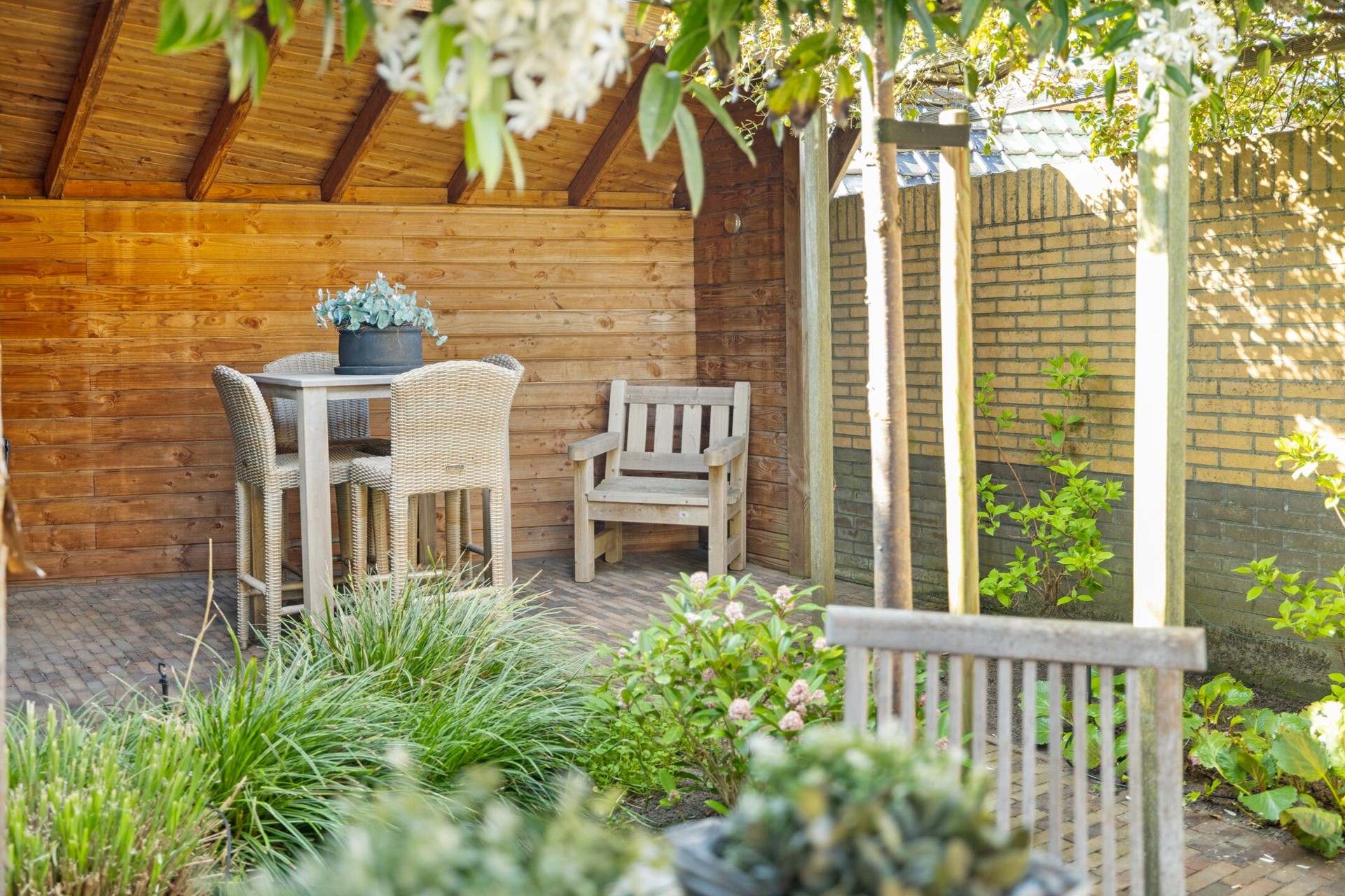 De fraai aangelegde, zonnige achtertuin is gelegen op het zuiden en biedt daardoor de hele dag door volop zon. De tuin is verzorgd aangelegd met een combinatie van sierbestrating, groenborders en meerdere sfeervolle zitplekken, waardoor u op ieder moment van de dag een fijne plek in zon of schaduw kunt vinden.