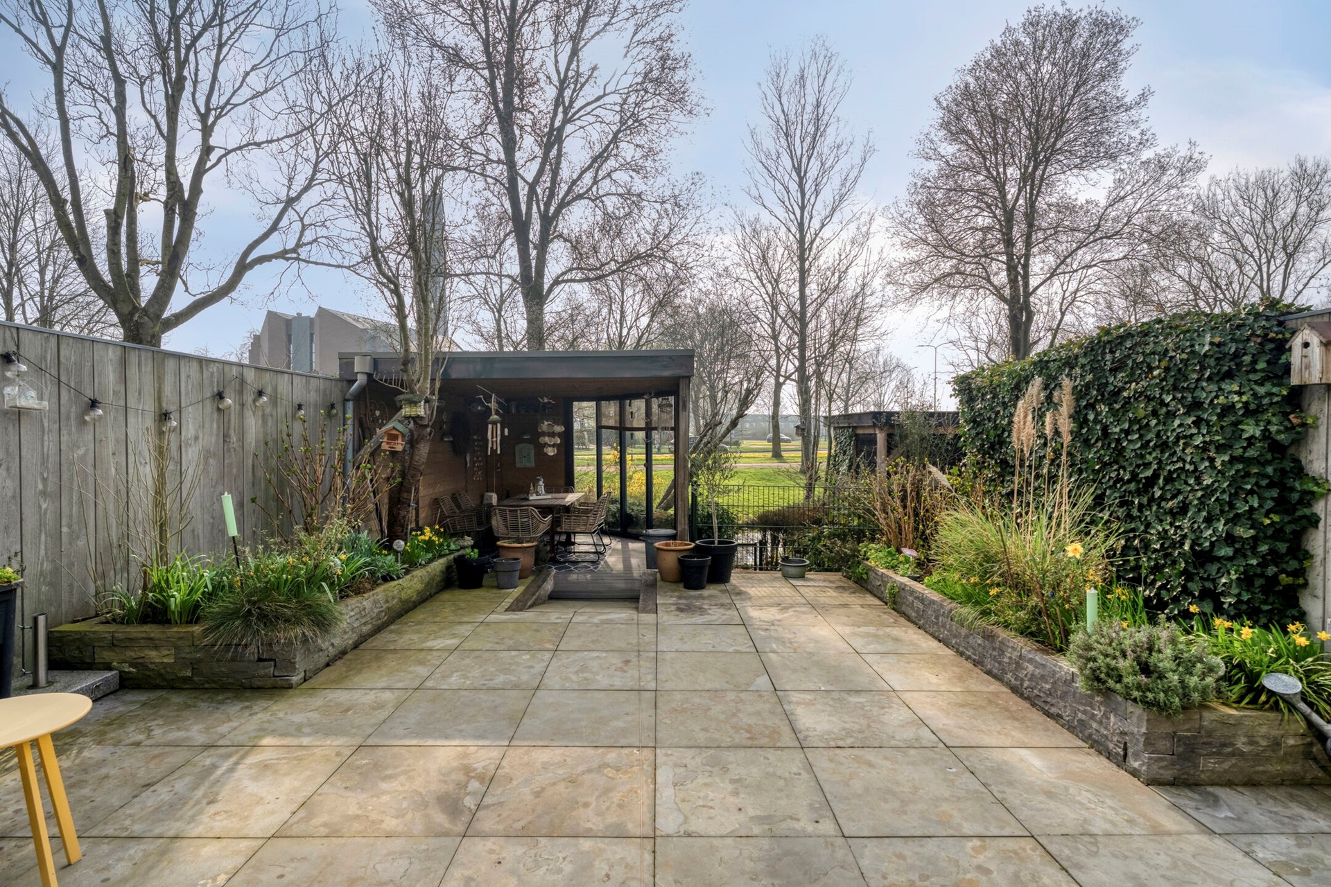 De tuin is verder fraai aangelegd met groene borders en beplanting, wat zorgt voor een prettige en natuurlijke uitstraling. Aan de achterzijde grenst de tuin aan een waterpartij en groenstrook, waardoor u een vrij en rustgevend uitzicht heeft.