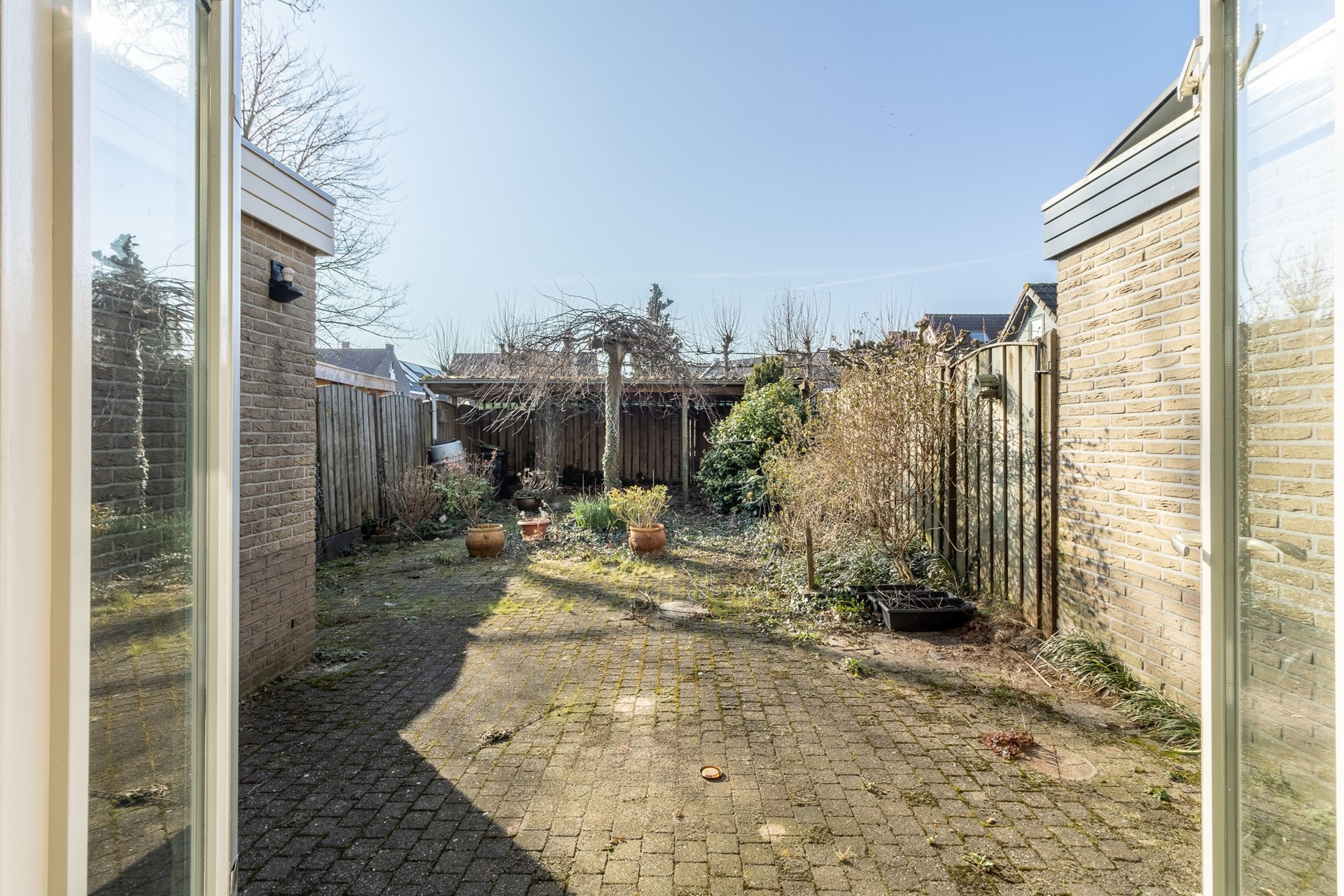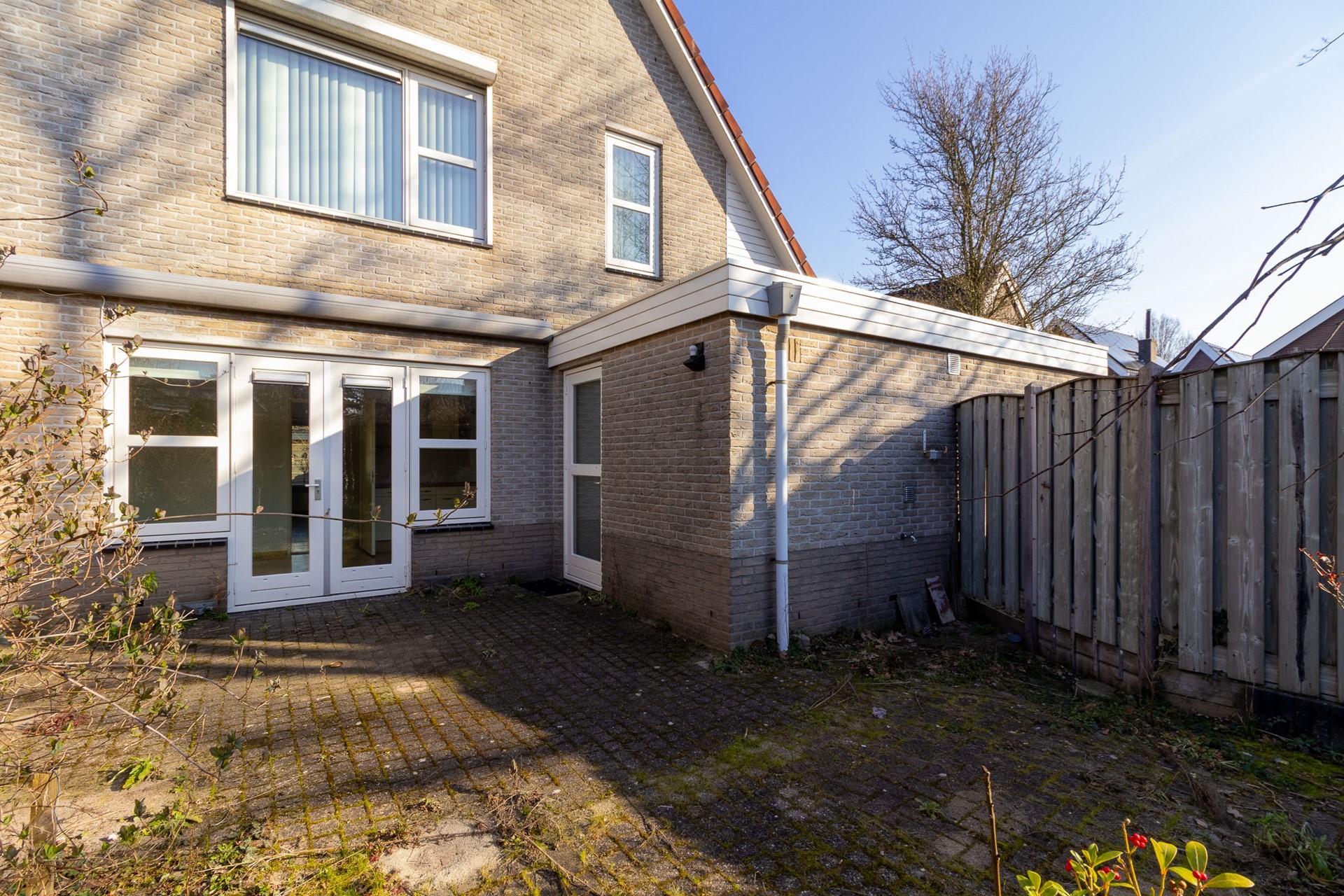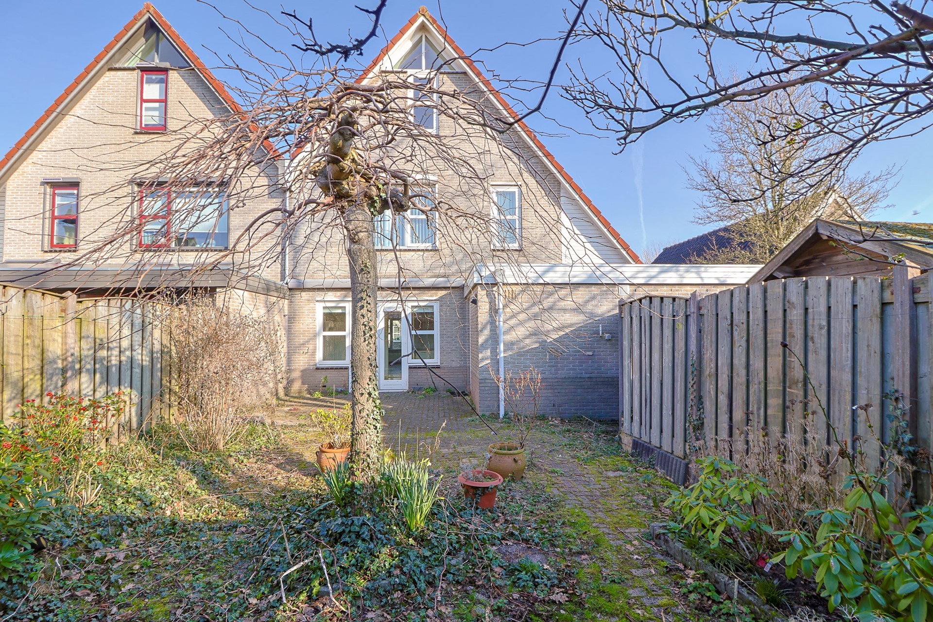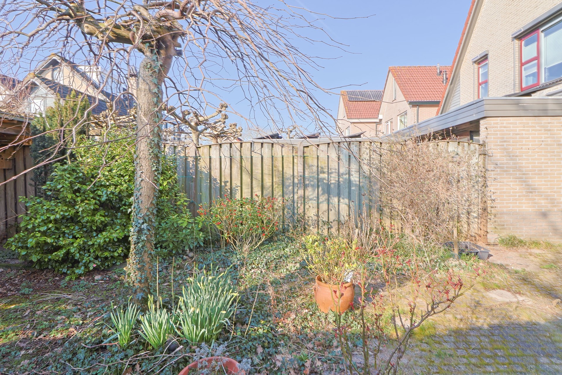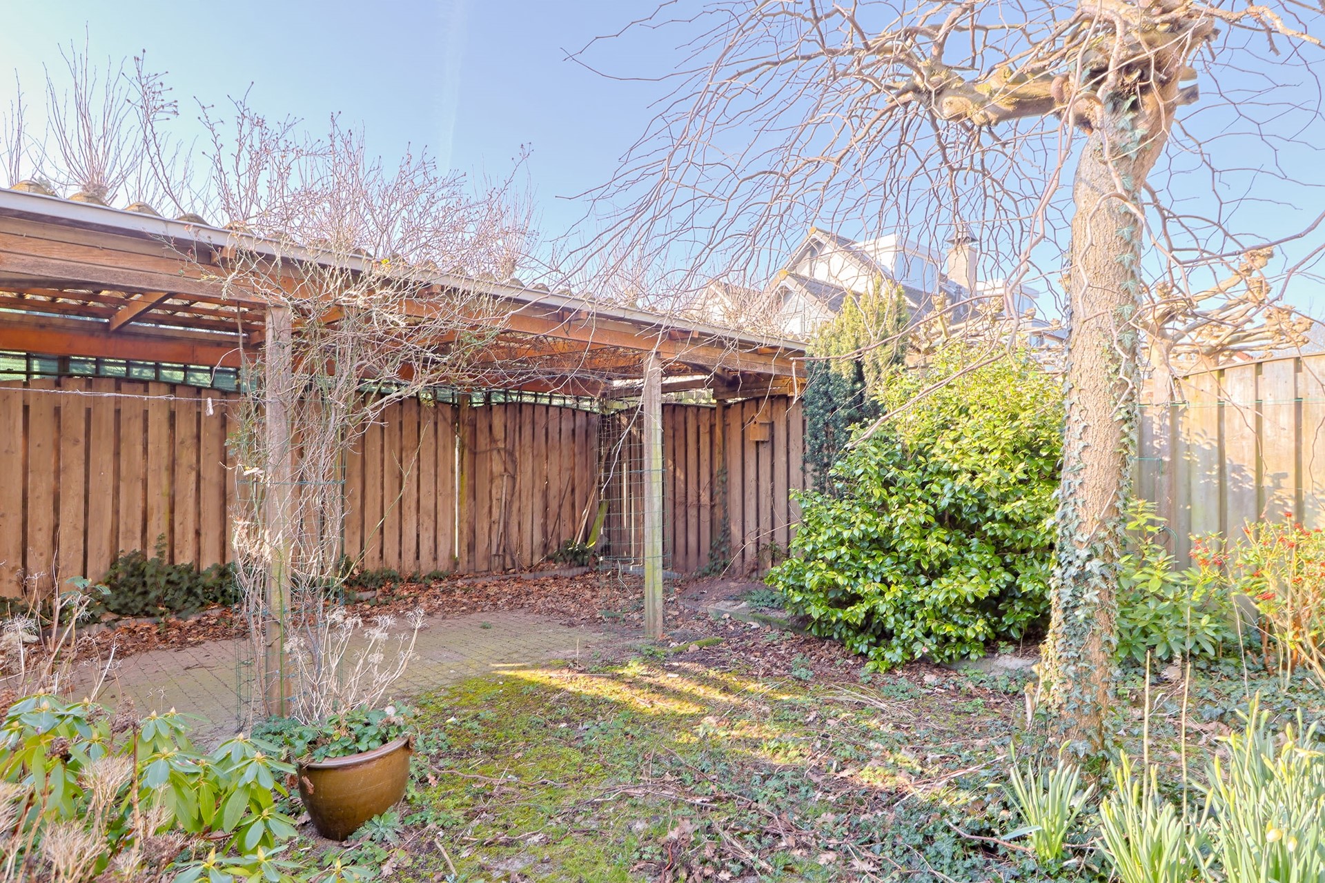 De achtertuin is gunstig gelegen op het zuiden en biedt daardoor volop zon gedurende de dag. De tuin is ingericht met een combinatie van bestrating en groen, waardoor er ruimte is voor zowel een terras als beplanting. Achterin bevindt zich een overkapping, ideaal voor het creëren van een beschutte zitplek. Dankzij de ligging en de privacy is dit een fijne plek om in alle rust van het buitenleven te genieten.