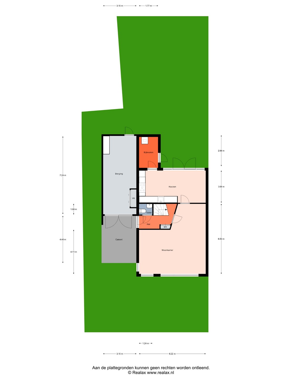 Entree in de hal met meterkast, toilet en trapopgang. Vanuit de hal bereik je de royale en lichte woonkamer aan de voorzijde. Aan de achterzijde bevindt zich de ruime keuken met openslaande deuren naar de tuin en toegang tot de praktische bijkeuken. De woning beschikt daarnaast over een garage en carport.