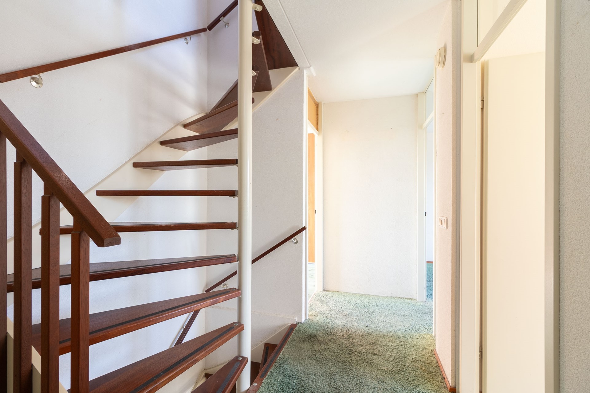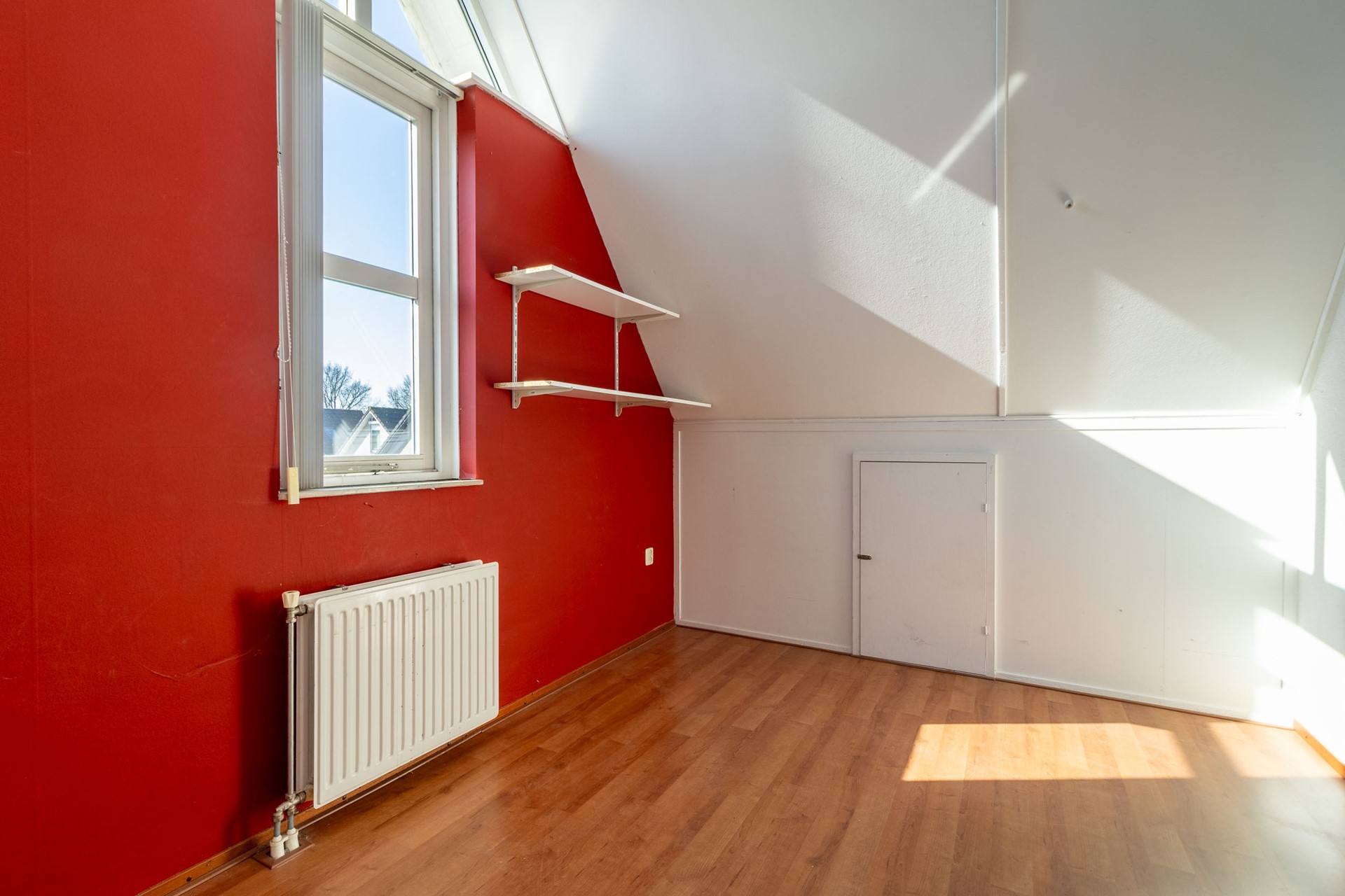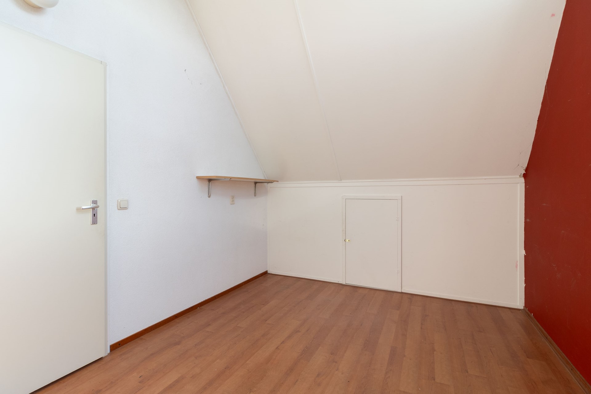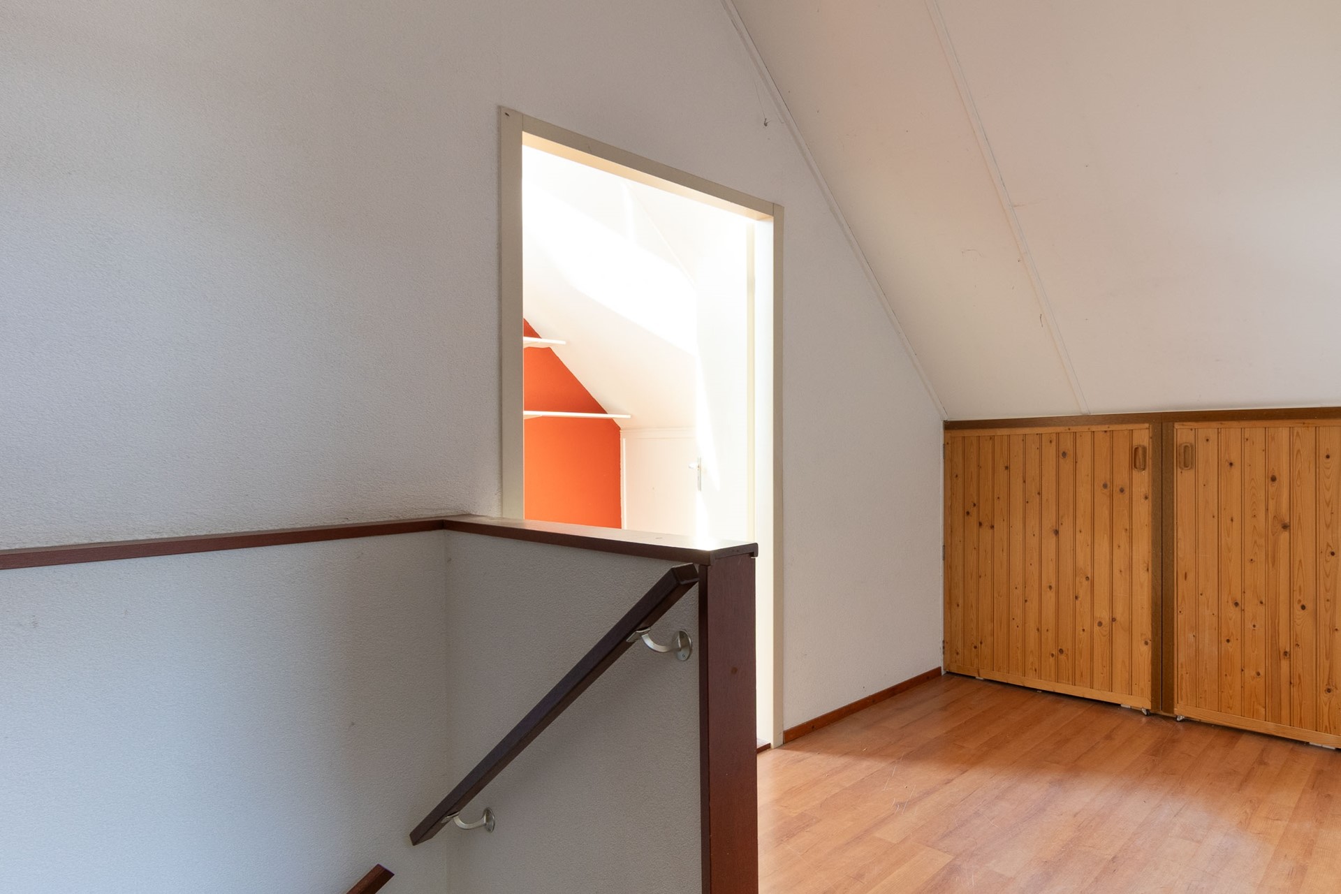 Overloop met toegang tot twee ruime slaapkamers. Aan beide zijden is praktische bergruimte aanwezig achter de knieschotten, ideaal voor extra opslag. Deze verdieping is multifunctioneel en geschikt als extra slaap-, werk- of hobbyruimte.