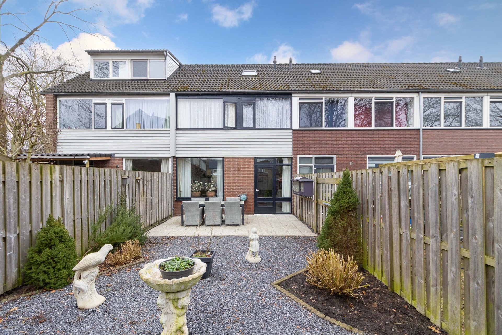 De tuin is onderhoudsvriendelijk aangelegd met een combinatie van bestrating, siergrind en vaste beplanting. Dankzij de praktische indeling is er voldoende ruimte voor meerdere zitplekken of speelgelegenheid.