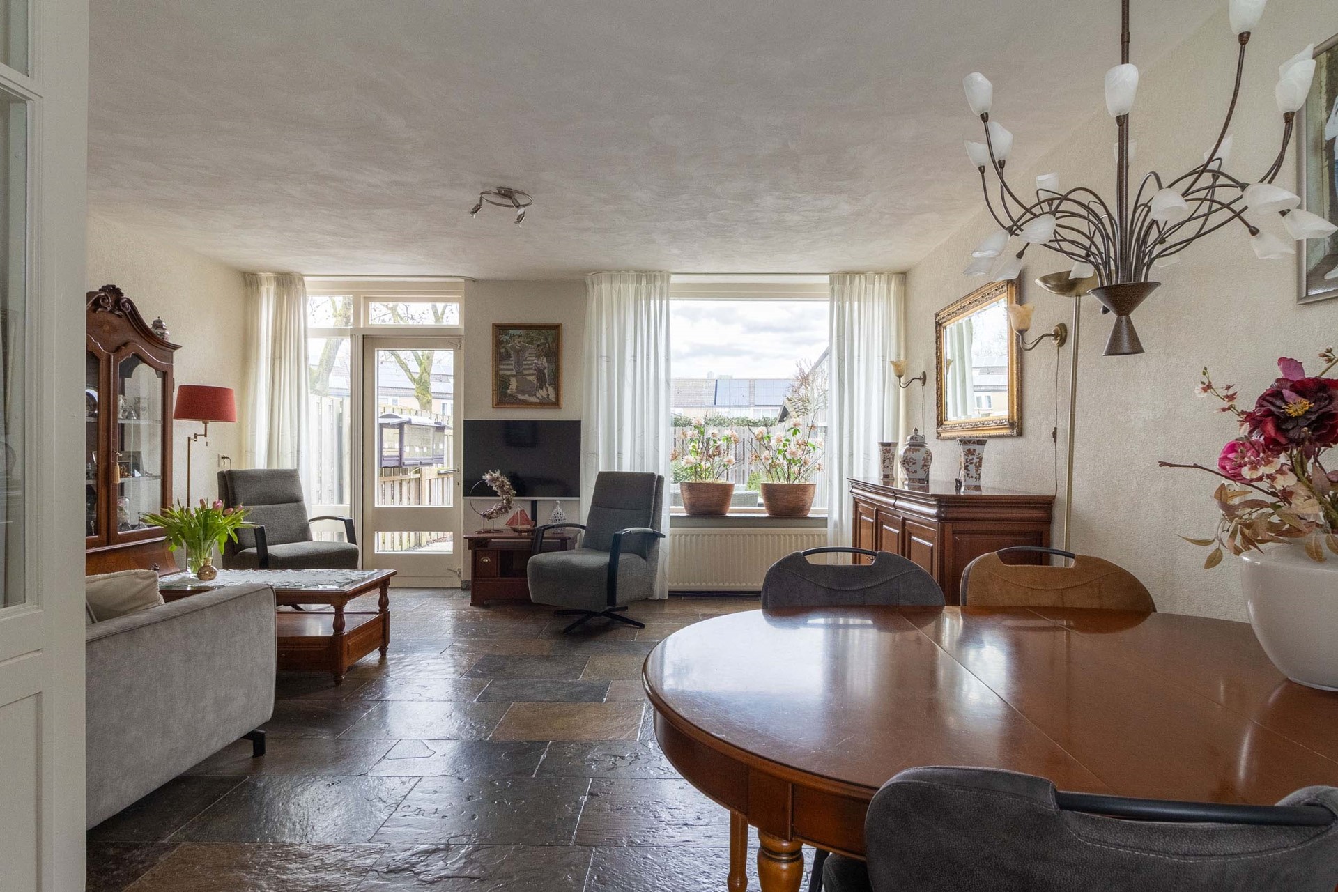 Binnen stap je in een lichte woonkamer waar comfort en mogelijkheden samenkomen. De vloerverwarming op de begane grond zorgt voor een aangename warmte en een strakke uitstraling. De indeling is logisch en biedt een mooie basis voor wie graag moderniseert of verbouwt. Hier kun je echt jouw eigen stijl tot leven brengen, zonder concessies te doen aan ruimte of functionaliteit. De keuken sluit prettig aan op de leefruimte, waardoor koken en samen zijn moeiteloos in elkaar overlopen.