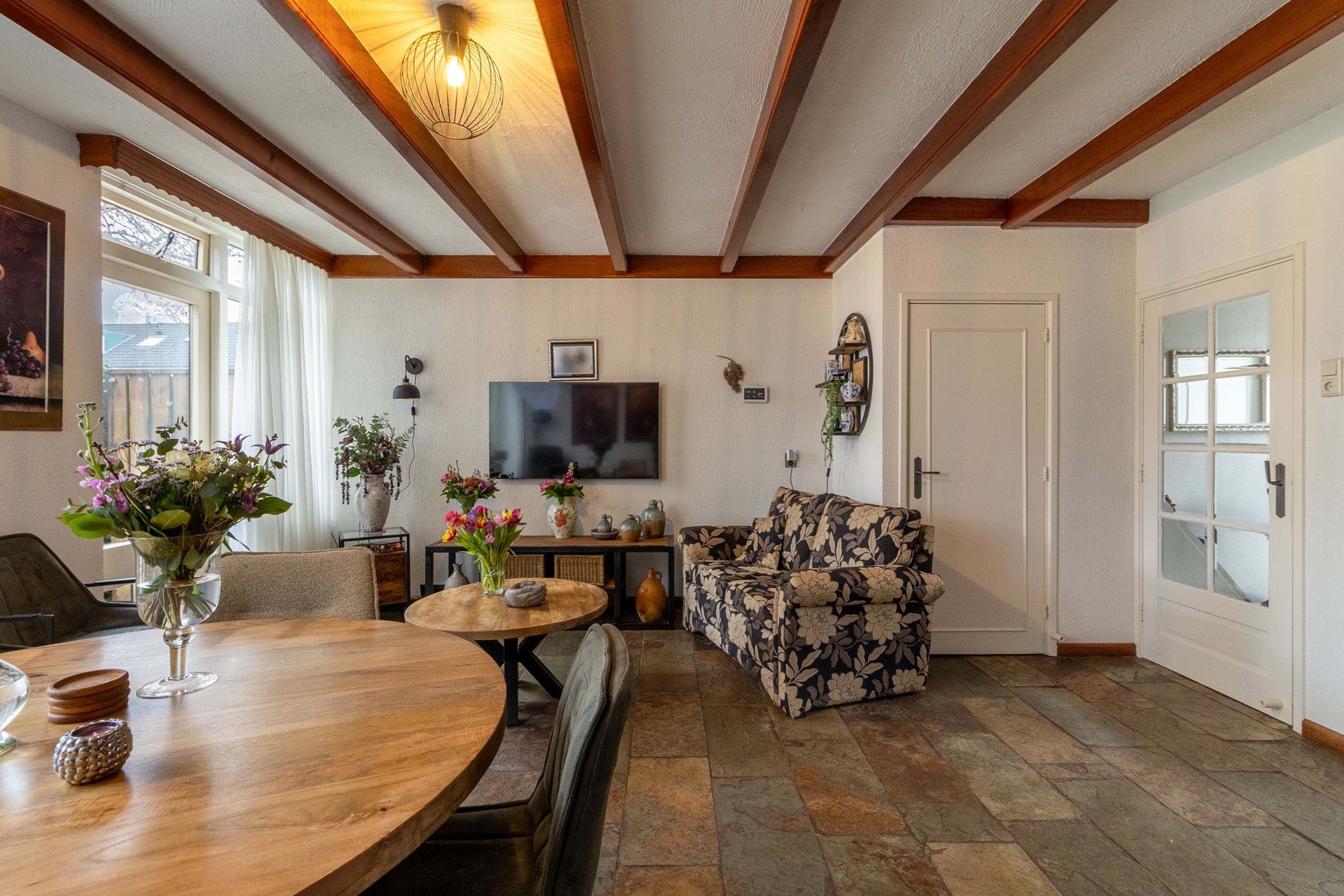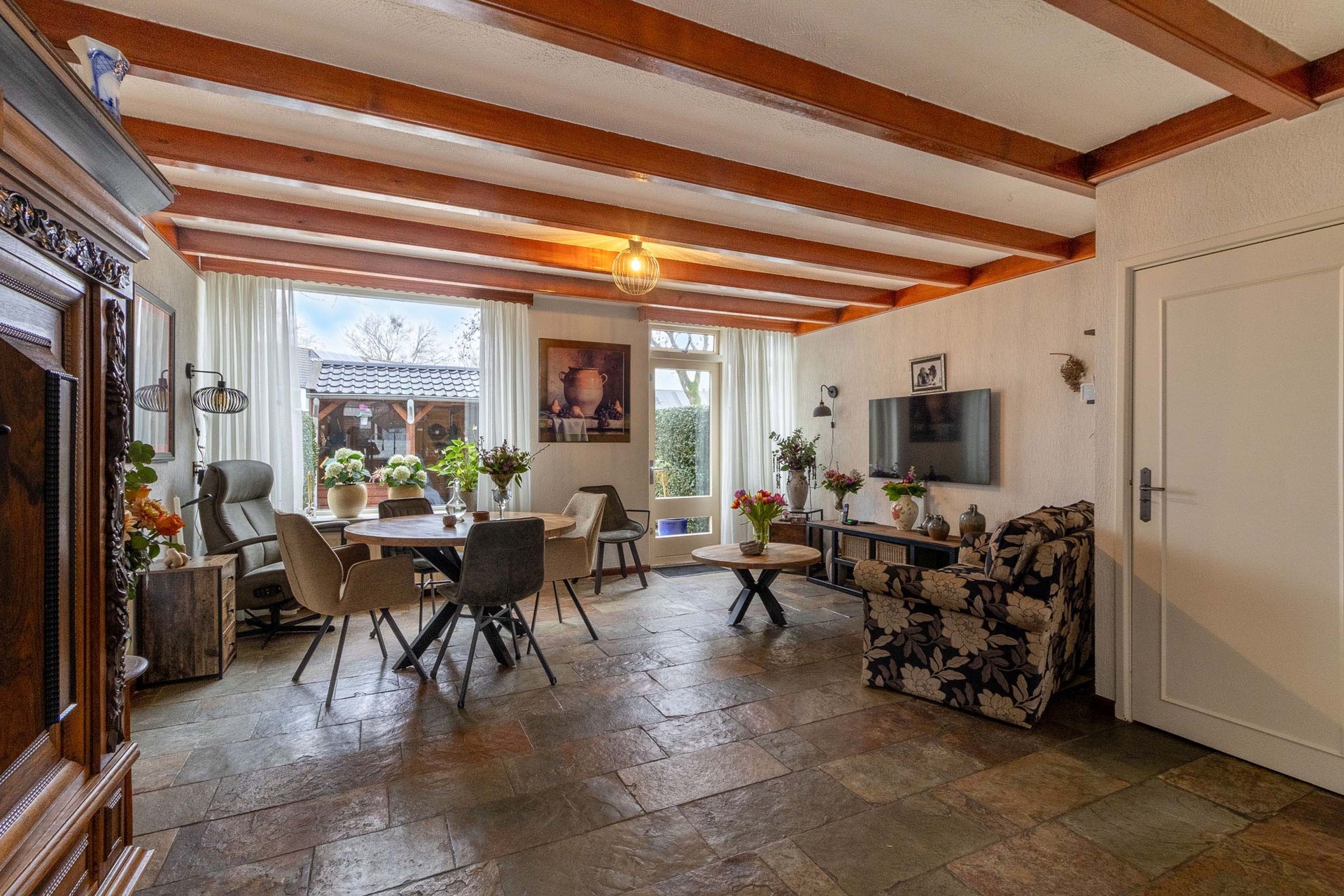 De woonkamer is ruim opgezet en strekt zich uit over vrijwel de gehele diepte van de woning. Dankzij de grote raampartijen aan zowel de voor- als achterzijde geniet de ruimte van veel natuurlijke lichtinval. De indeling biedt volop mogelijkheden voor het creëren van een comfortabele zit- en eethoek.