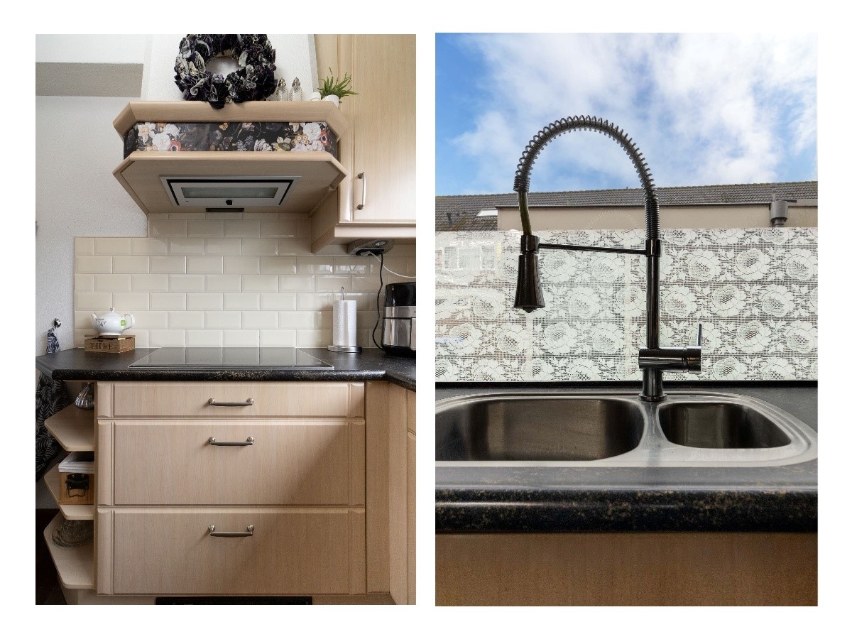 Aan de voorzijde bevindt zich de open keuken, geplaatst in een praktische opstelling met voldoende werk- en bergruimte. Vanuit de woonkamer is tevens de achterdeur bereikbaar, met directe toegang tot de tuin.