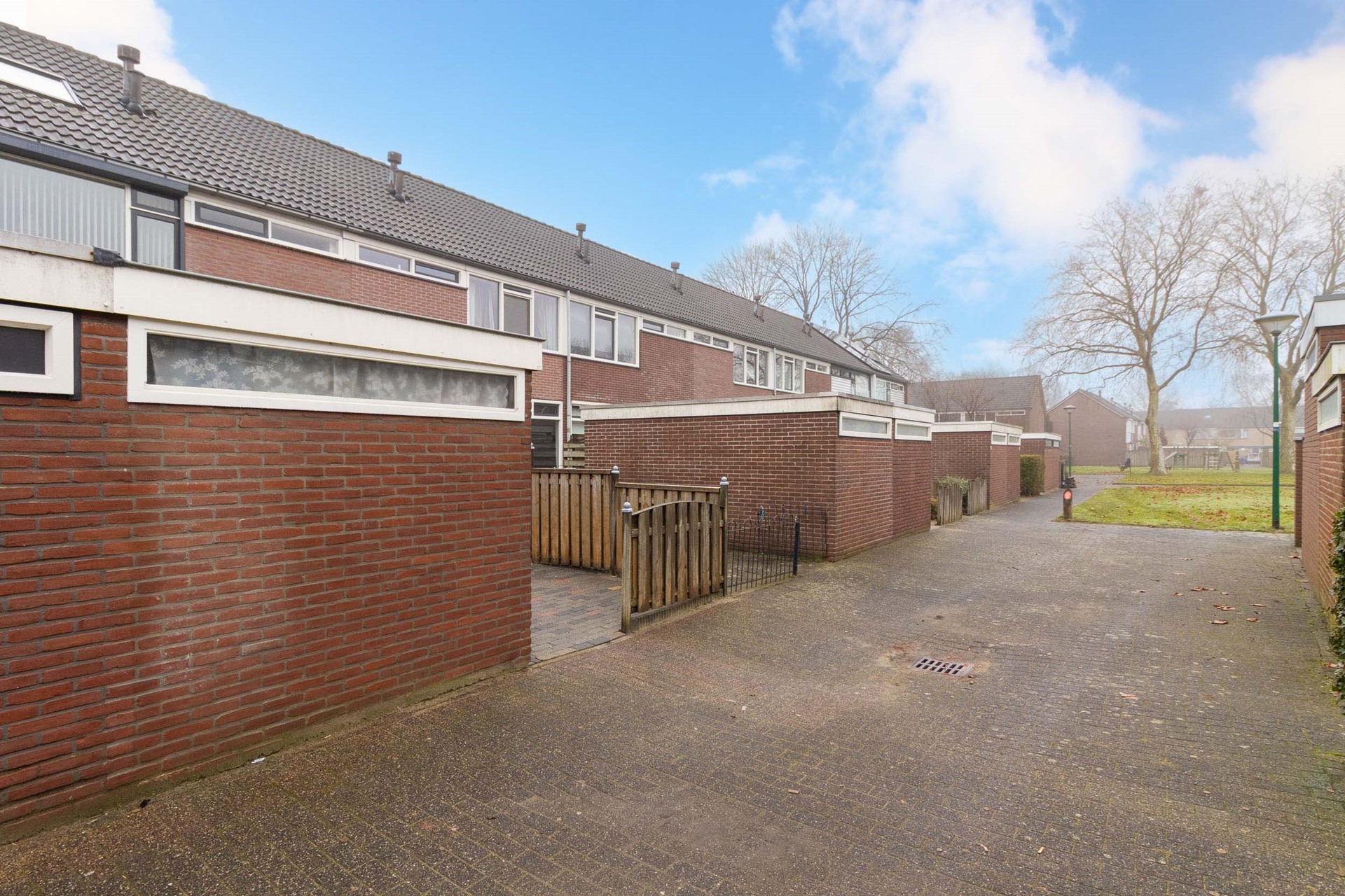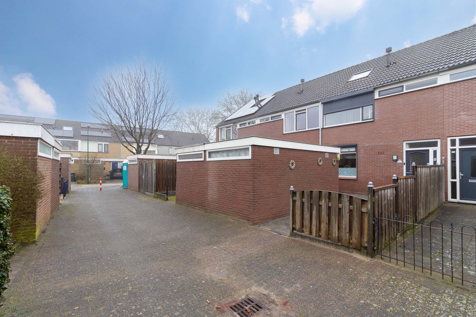 De tuin is tevens voorzien van een praktische achterom, ideaal voor het stallen van fietsen of het gemakkelijk bereiken van de tuin zonder door de woning te hoeven.