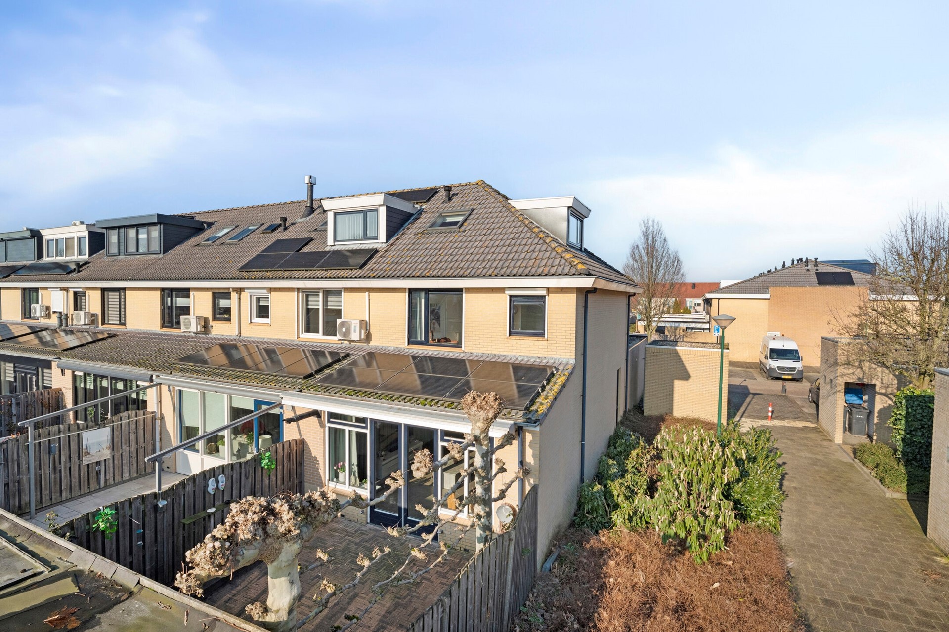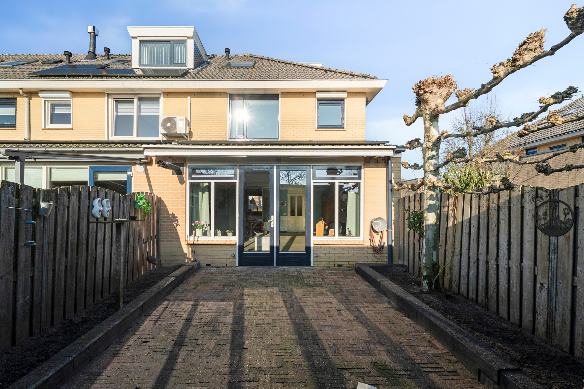 De tuin beschikt bovendien over een praktische achterom, wat ideaal is voor bijvoorbeeld fietsen of het bereiken van de woning via de achterzijde.