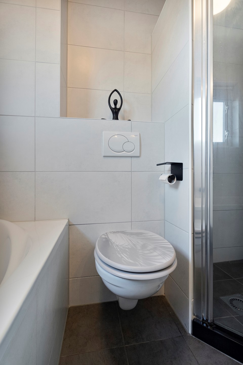 De badkamer is centraal gelegen en voorzien van een ligbad, douche, wastafelmeubel en toilet. Dankzij de efficiënte indeling is dit een complete en functionele ruimte.