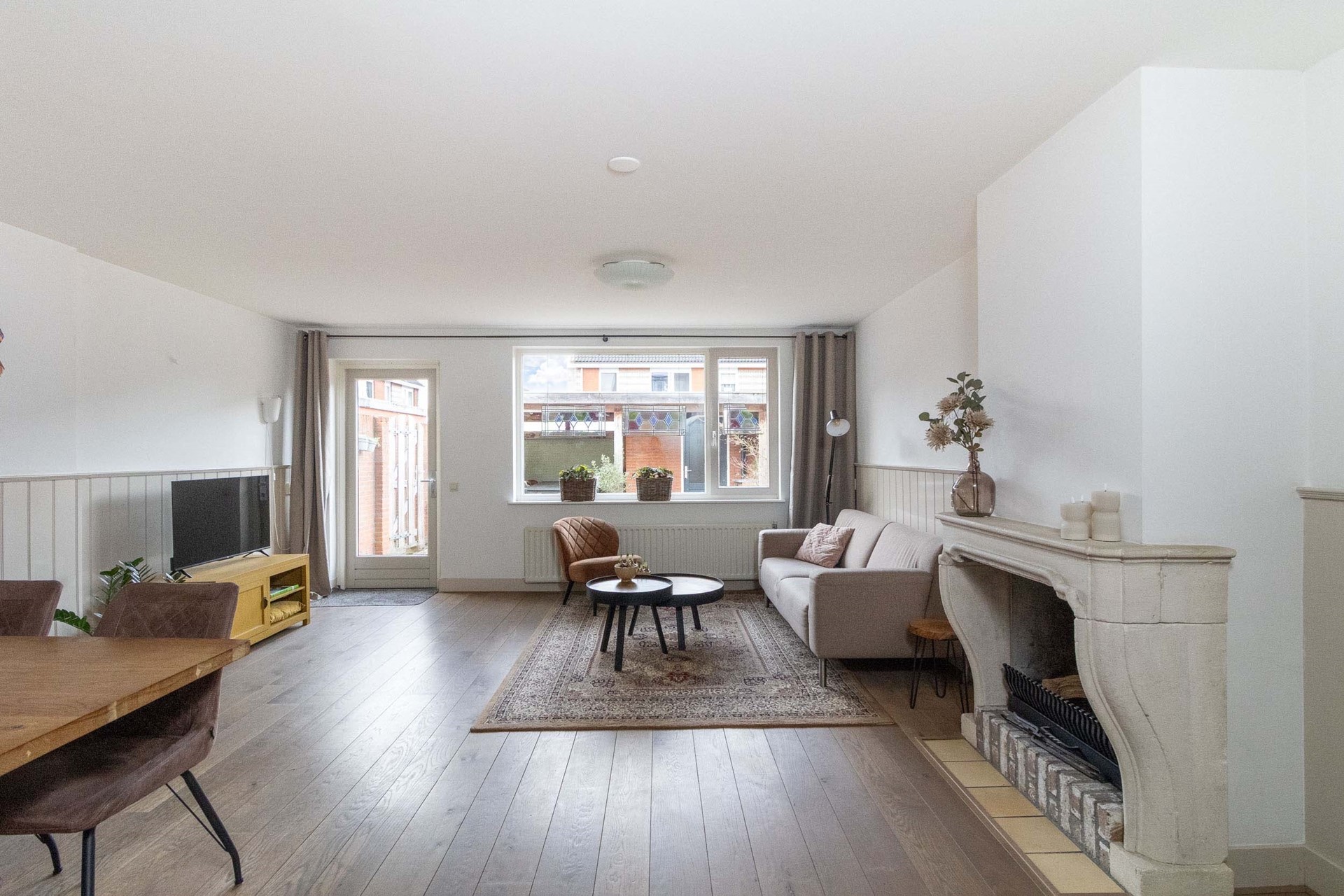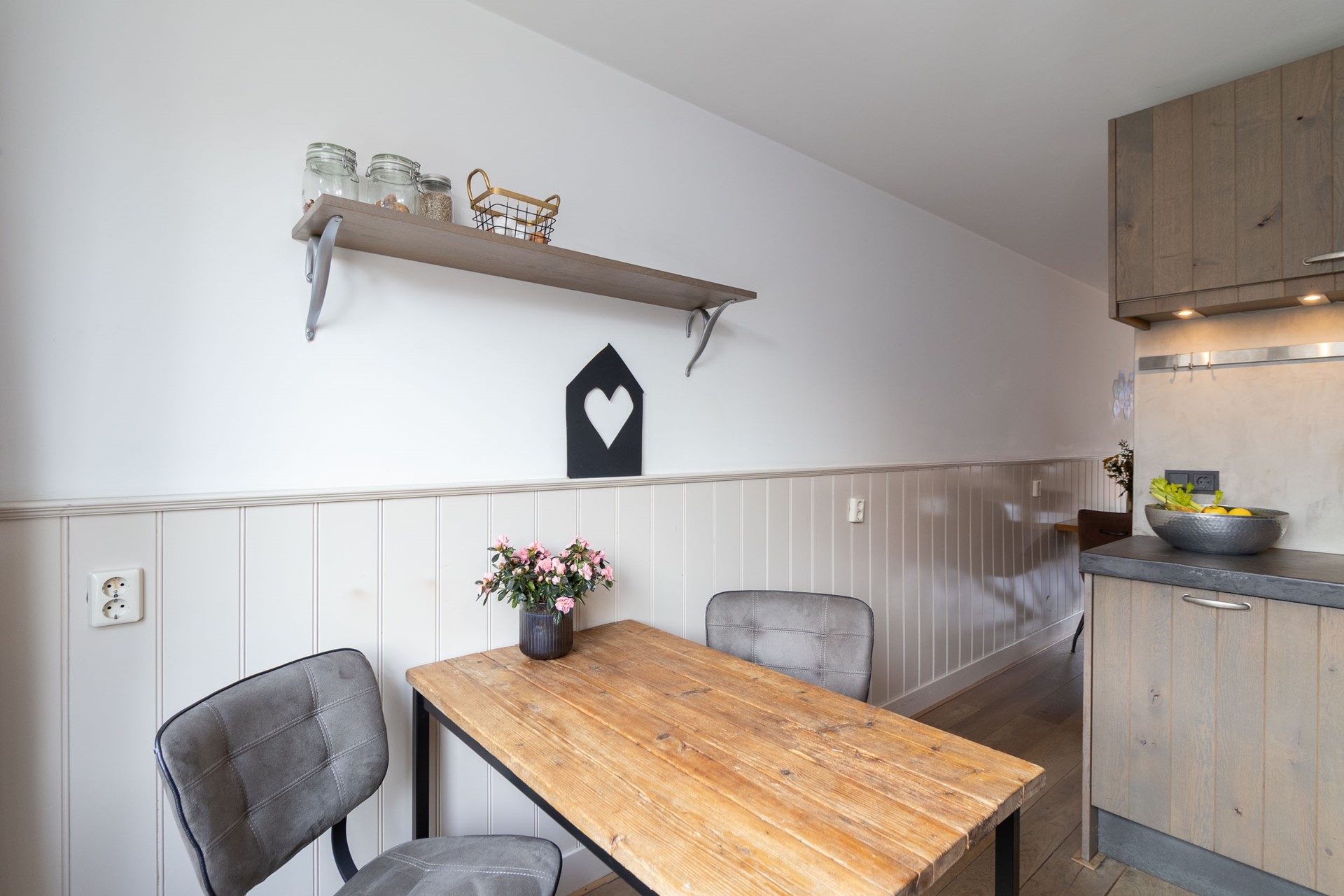 De begane grond verrast met een royale leefruimte dankzij de uitbouw. Hierdoor ontstaat een fijne openheid waarin wonen, eten en samen zijn moeiteloos in elkaar overlopen. De houten vloer en de open haard zorgen voor warmte en karakter en geven de ruimte een huiselijk, knus gevoel.