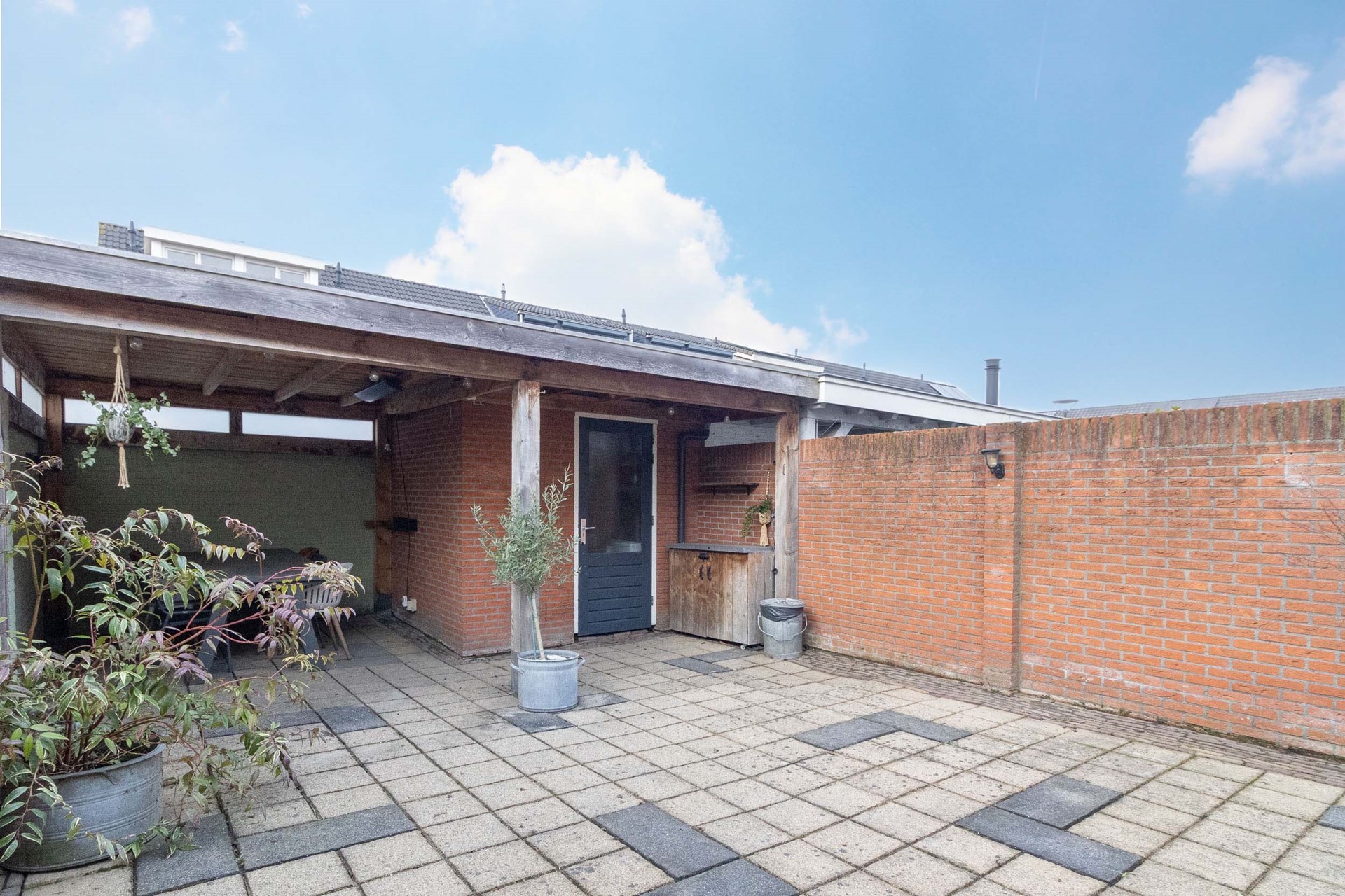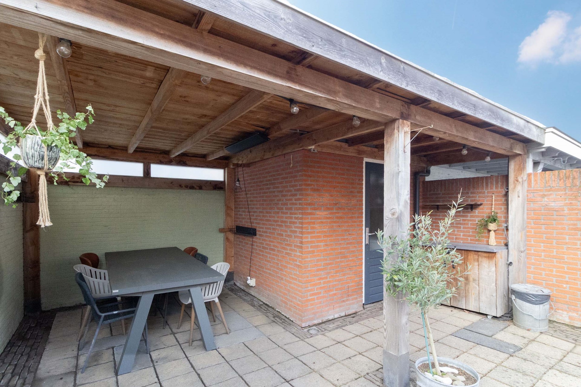 Achterin de tuin bevindt zich een overkapping met een beschutte zithoek, ideaal om het hele jaar door buiten te kunnen zitten. Aangrenzend is een praktische berging gesitueerd, voorzien van elektra en bereikbaar via een eigen deur. Hier is tevens ruimte voor opslag en het stallen van fietsen.