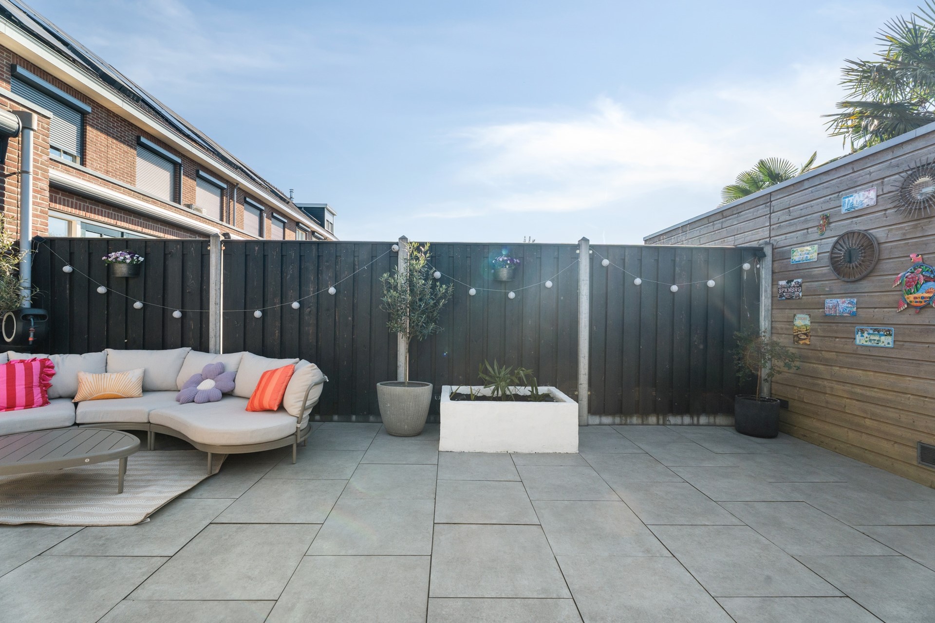 De fraai aangelegde achtertuin is gelegen op het zonnige zuiden en vormt een heerlijke plek om te ontspannen. De tuin is bijna volledig bestraat en daardoor onderhoudsvriendelijk, met volop ruimte voor zowel een loungehoek als een eettafel.