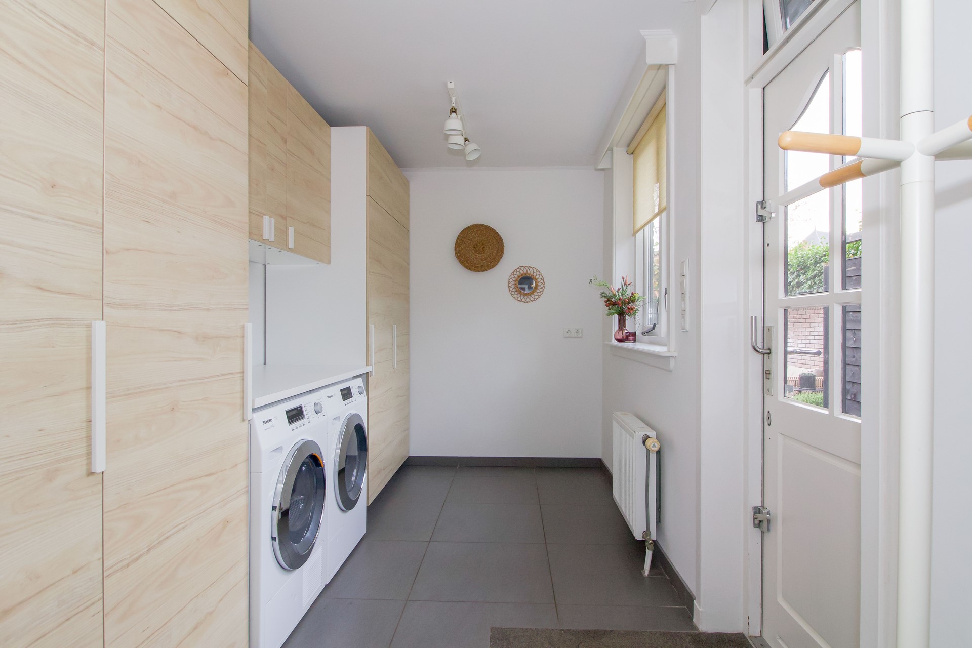 Beneden loopt de ruimte prettig in elkaar over. De woonkamer voelt uitnodigend, terwijl de keuken modern is en flink van formaat, een plek waar koken en samenkomen vanzelf samenkomen. De bijkeuken met wasruimte is een fijne, praktische toevoeging die je dagelijks gemak geeft.