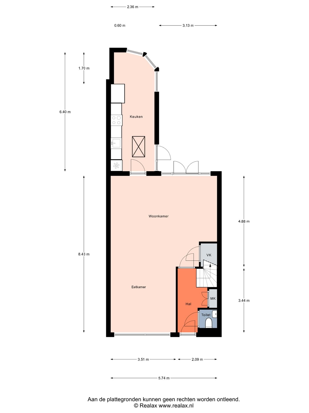 Via de voordeur kom je binnen in de hal, waar zich de meterkast (MK) en het toilet met fonteintje bevinden. Vanuit de hal is er toegang tot zowel de trapopgang naar de verdieping als tot de royale woonkamer.