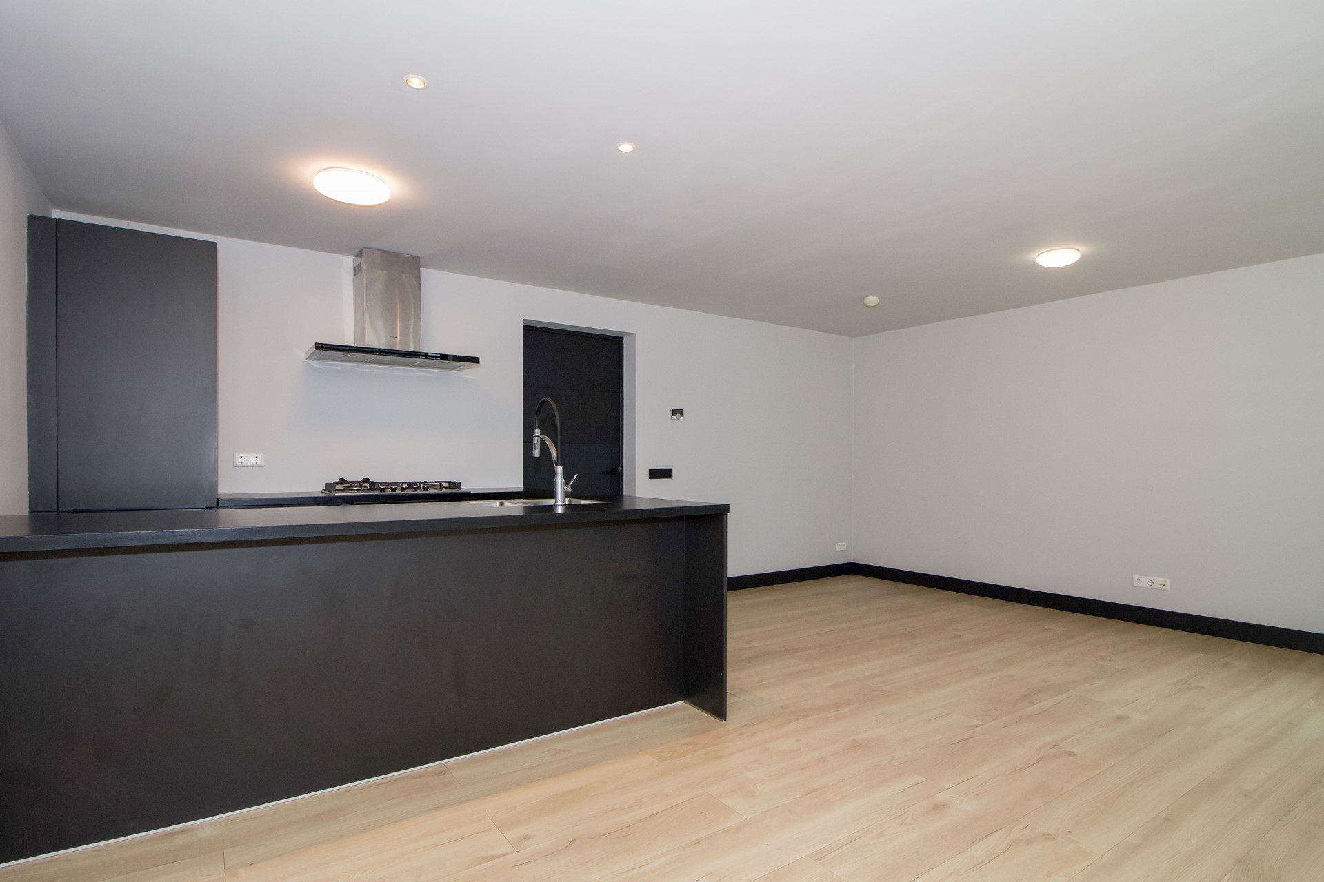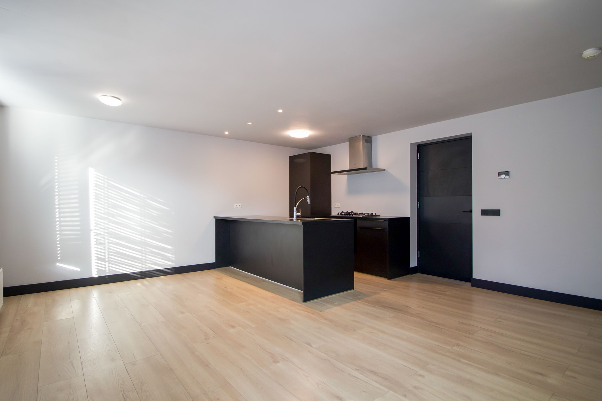 De woonkamer is ruim opgezet en geniet van veel lichtinval dankzij de grote raampartijen aan de voorzijde. De open keuken bevindt zich aan de zijkant van de woonkamer en is voorzien van een modern keukenblok met inbouwapparatuur en voldoende werk- en kastruimte.