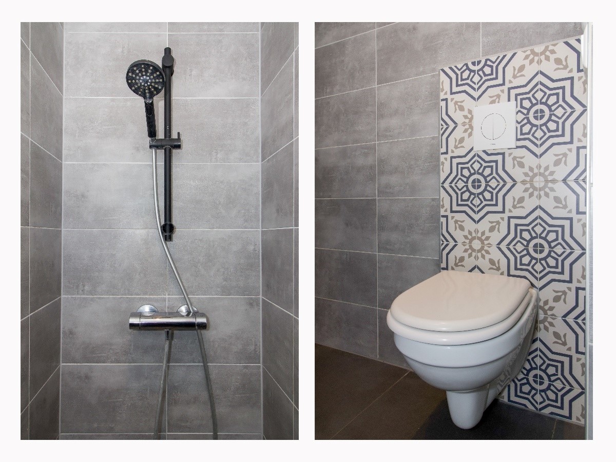 De badkamer is compact maar functioneel ingericht en beschikt over een douche, wastafel en toilet.